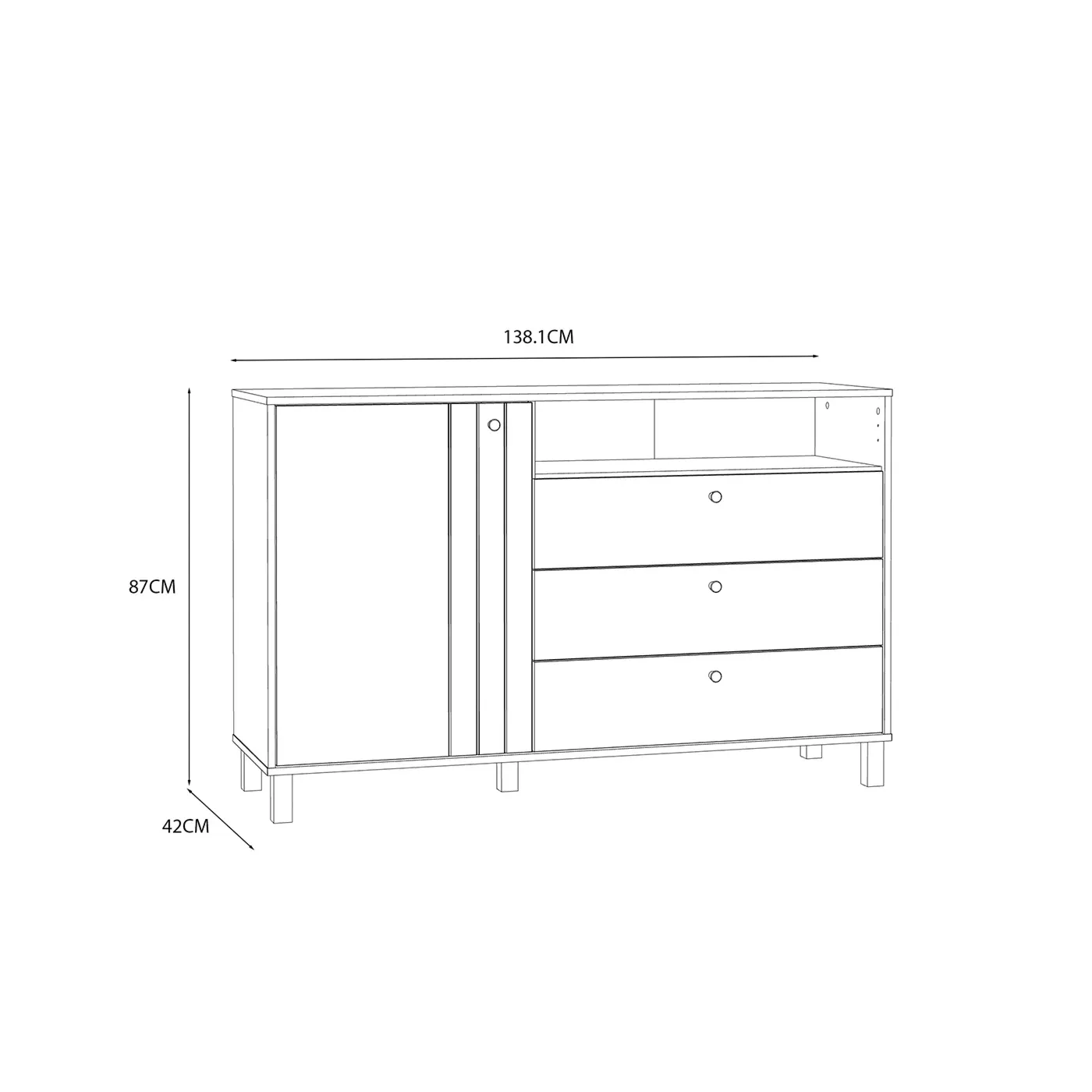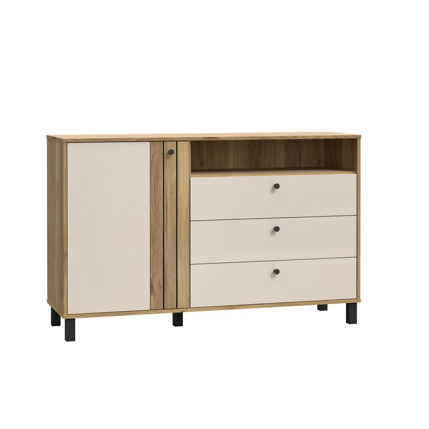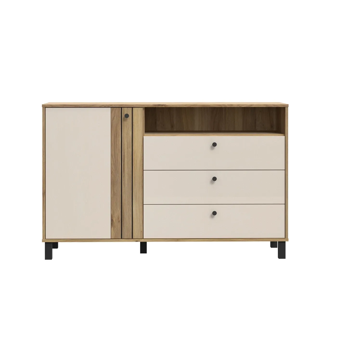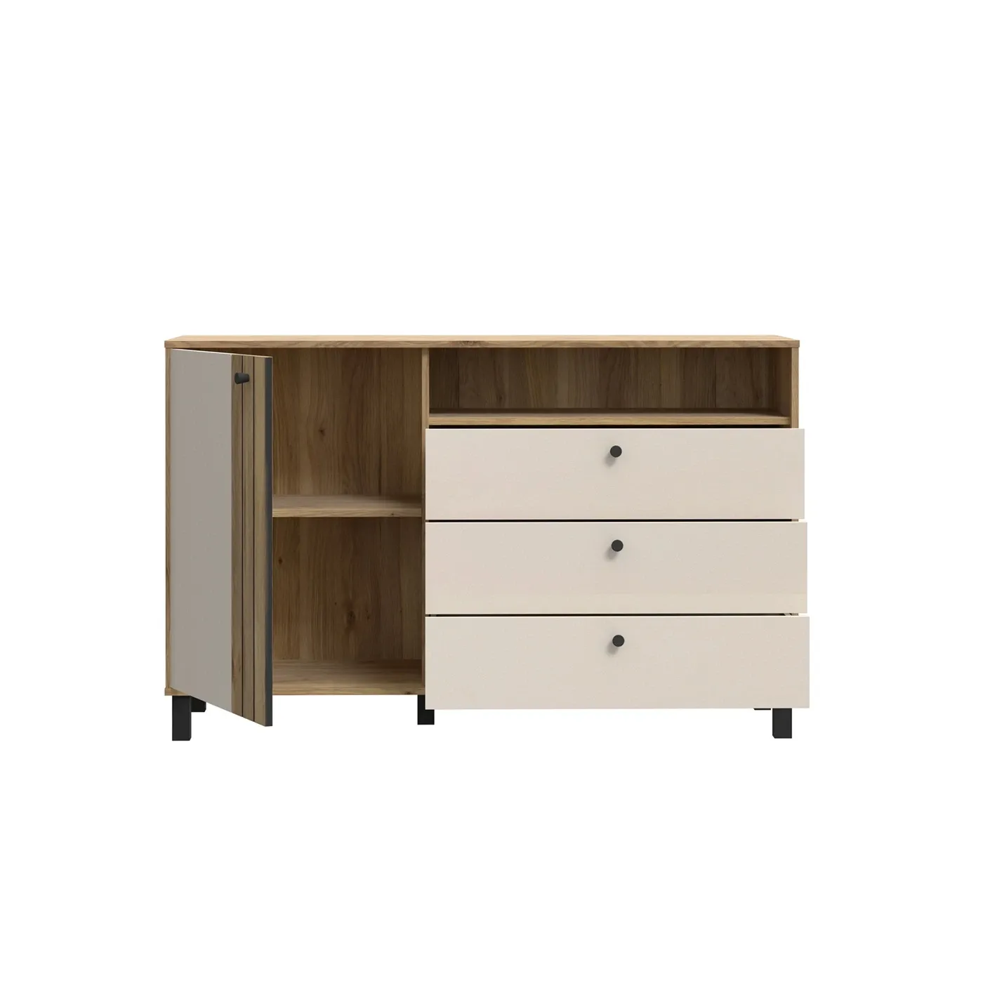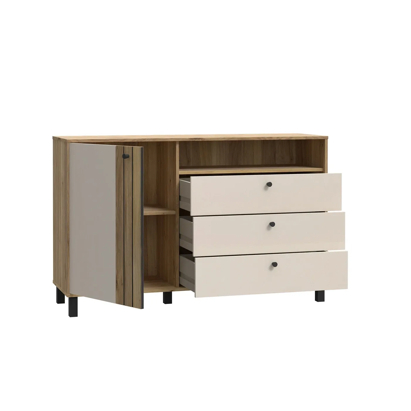Madia moderna con anta, tre cassetti ed un vano a giorno, adatta a soggiorni, ingressi, cucine o uffici. Finitura Rovere e Sabbia.
