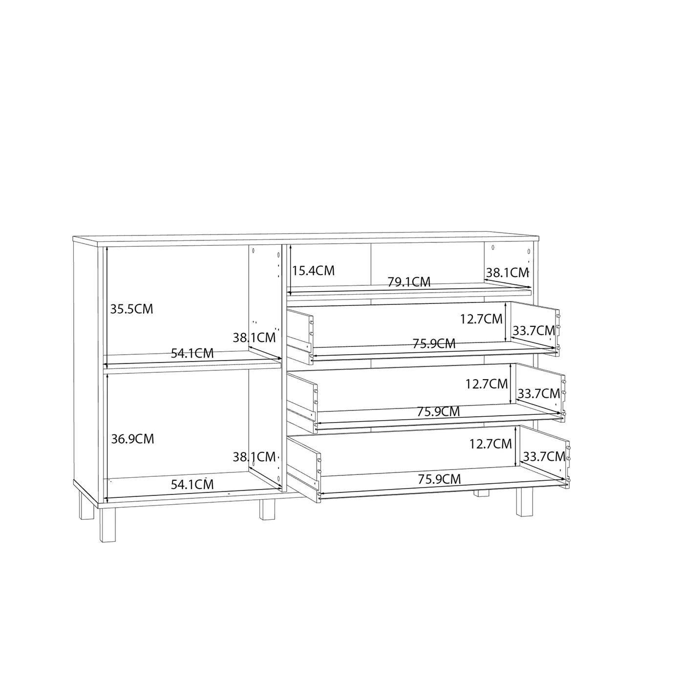 Le dimensioni contenute della credenza non incidono sulla capienza: dotata di un'anta con ripiano interno, tre cassetti ed un vano a giorno viene garantito un ampio spazio contenitivo per oggetti vari.