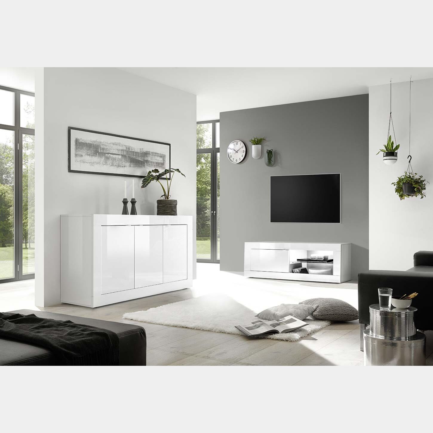 Madia moderna di design in finitura bianco lucido, si trova nella collezione Beta. E' disponibile anche con ante in fnitura pero o cemento.