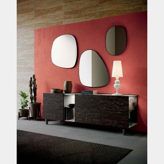 E' caraterrizata dalla presenza di 3 ante in finitura Legno bruciato e da 3 vani a giorno con ripiano in vetro fumè. Pensata per avere un maggiore spazio utile di appoggio, questa madia offre la soluzione ideale che unisce eleganza e praticità. La struttura è in Grigio seta, è possibile personalizzare le finiture. La madia vine fornita con i piedini base H.2 cm.