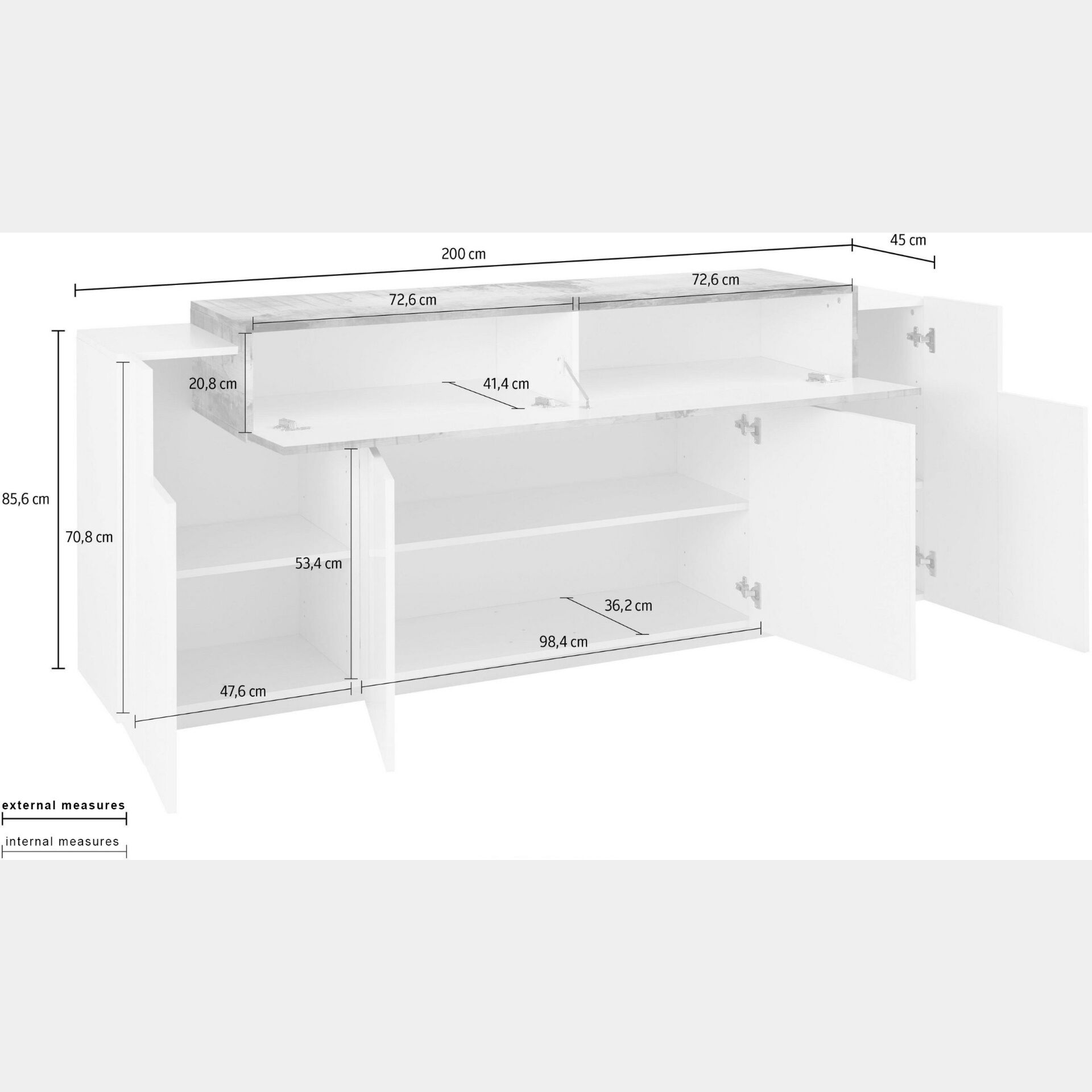 La madia è composta da una ribalta superiore con divisorio centrale in finitura ardesia e da 4 ante bianche. Al suo interno presenta un ripiano centrale per vano, questo la rende molto capiente e pratica.