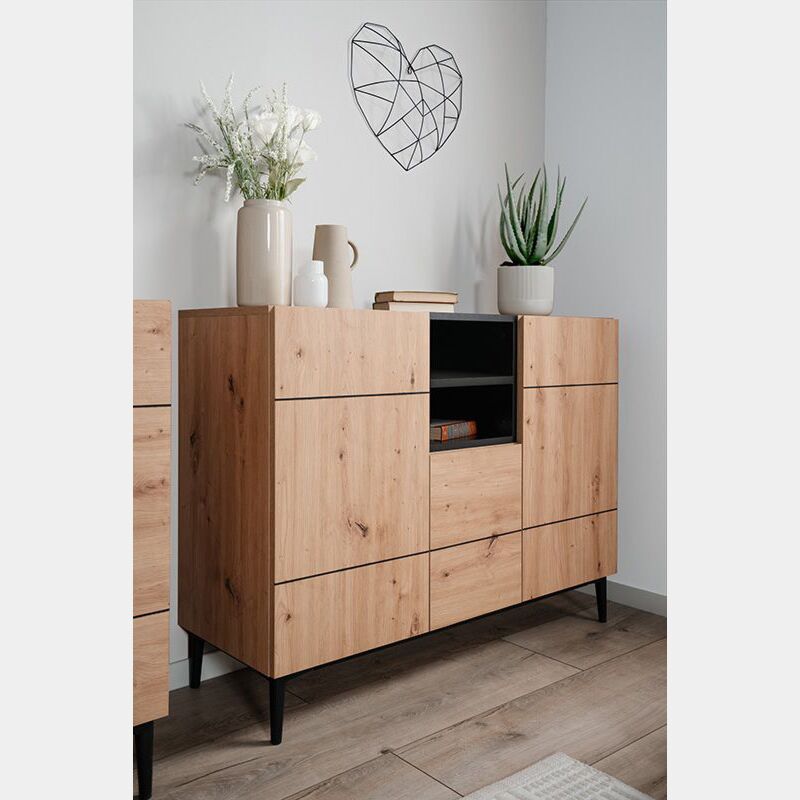La madia Glesborg presenta 3 ante e un vano a giorno, all'interno sono previsti 5 ripiani, 2 nelle ante laterali e uno in quella centrale. La sua finitura in rovere e nero carbone le dona uno stile personalizzato e innovativo rendendo il living caldo e accogliente.