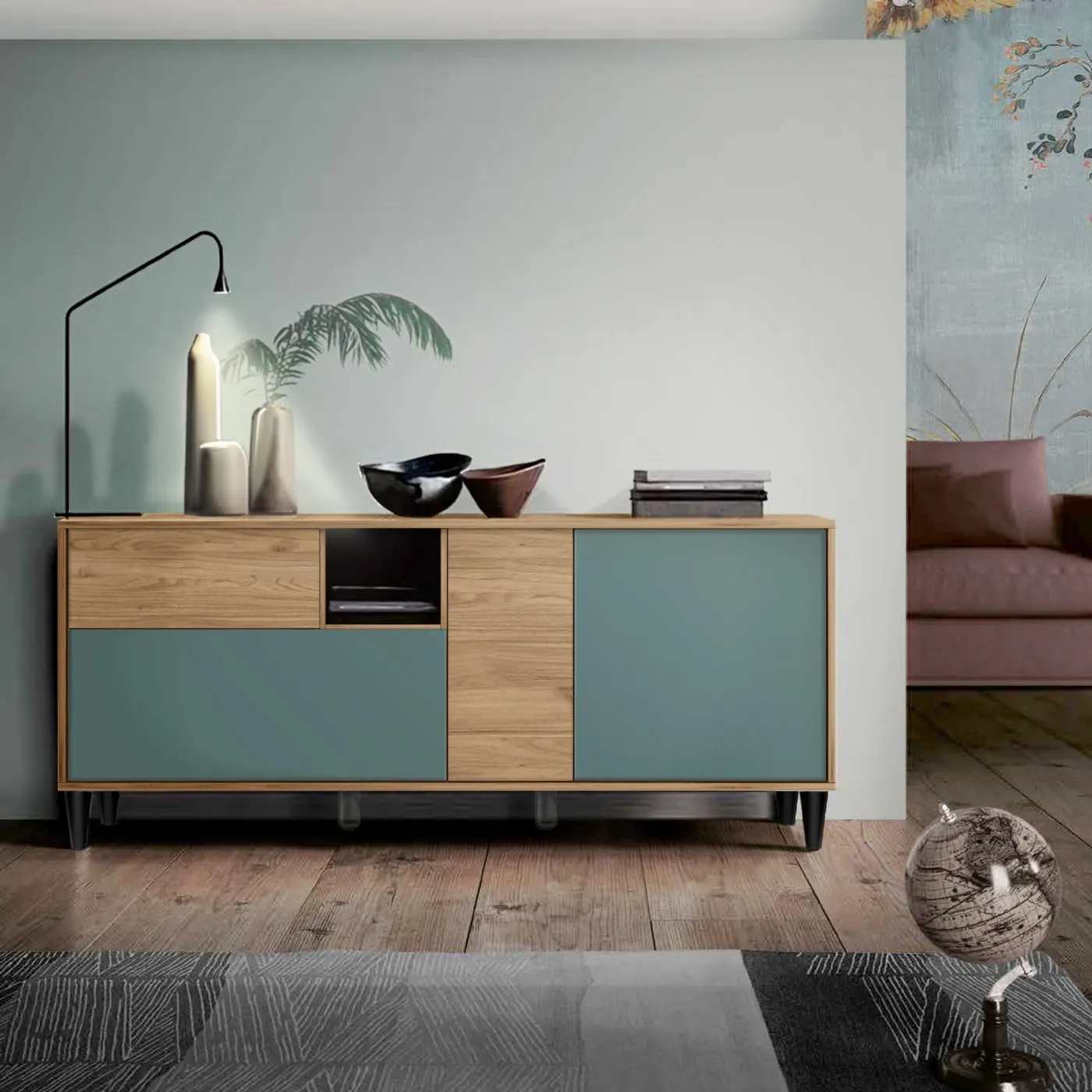 Le tinte Noce biondo e Salvia creano un piacevole contrasto che valorizza la linea del mobile, assicurando un complemento d'arredo originale e di impatto.