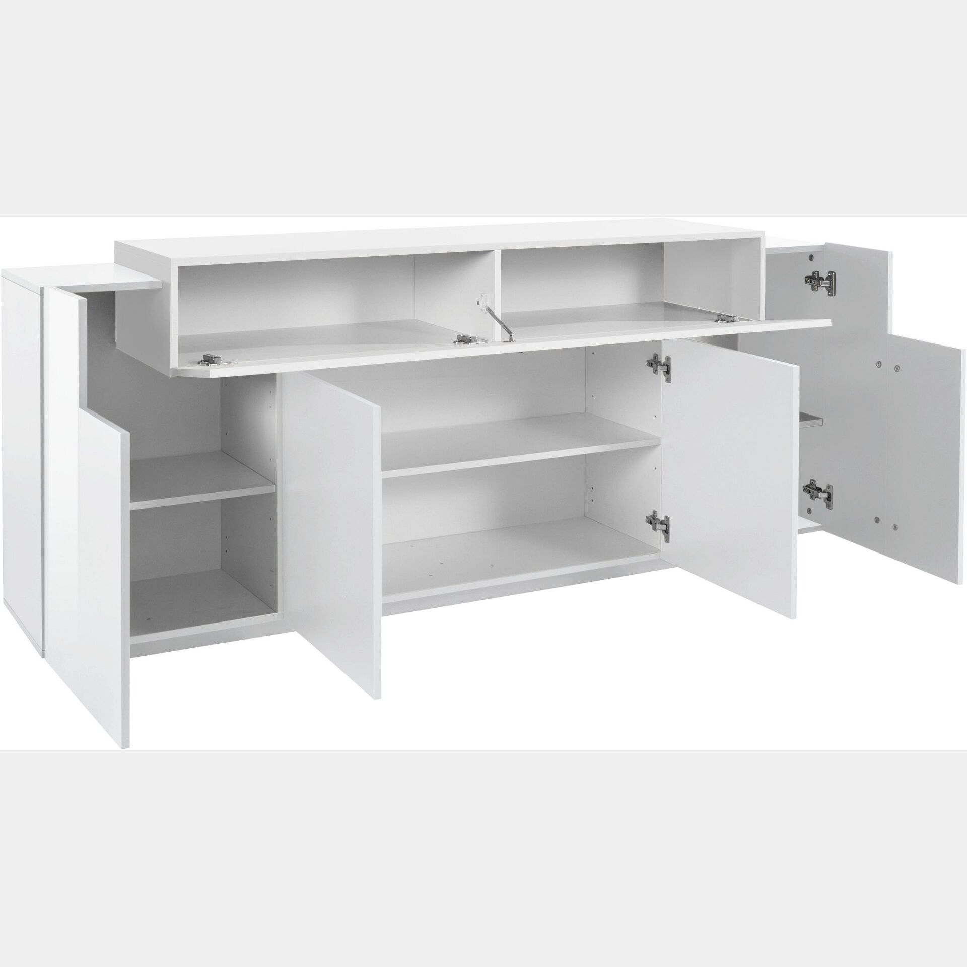 La credenza moderna garantisce un'ampia capienza grazie alle 4 ante battenti e alla ribalta superiore.