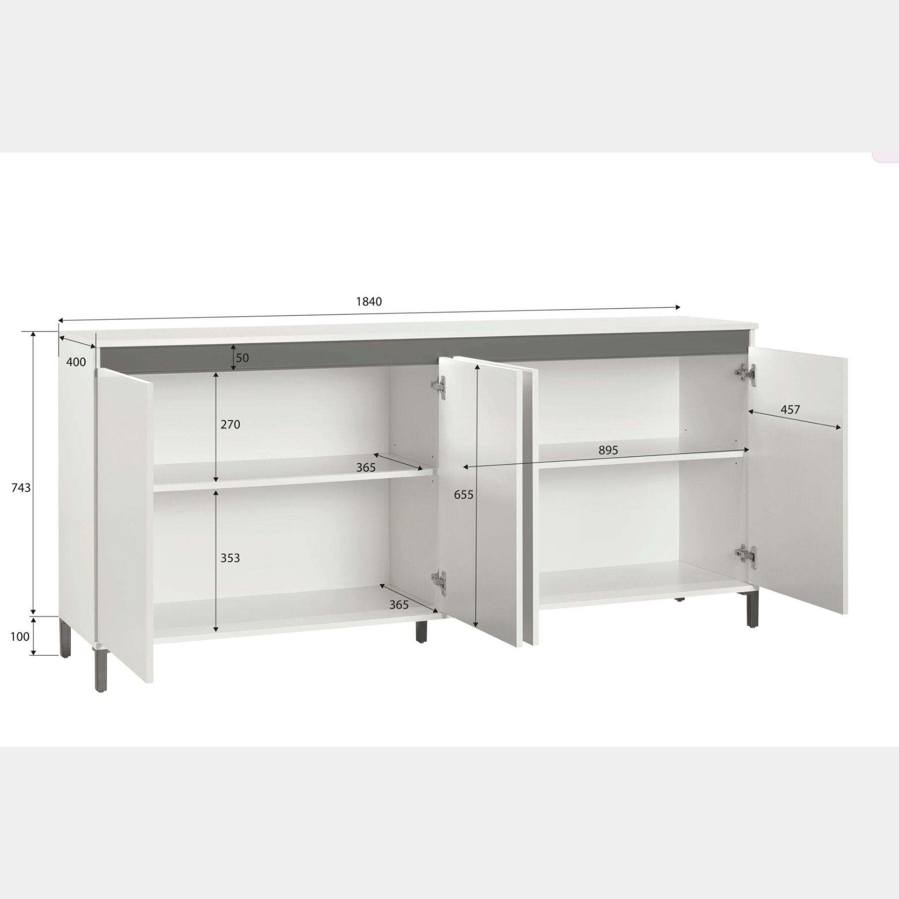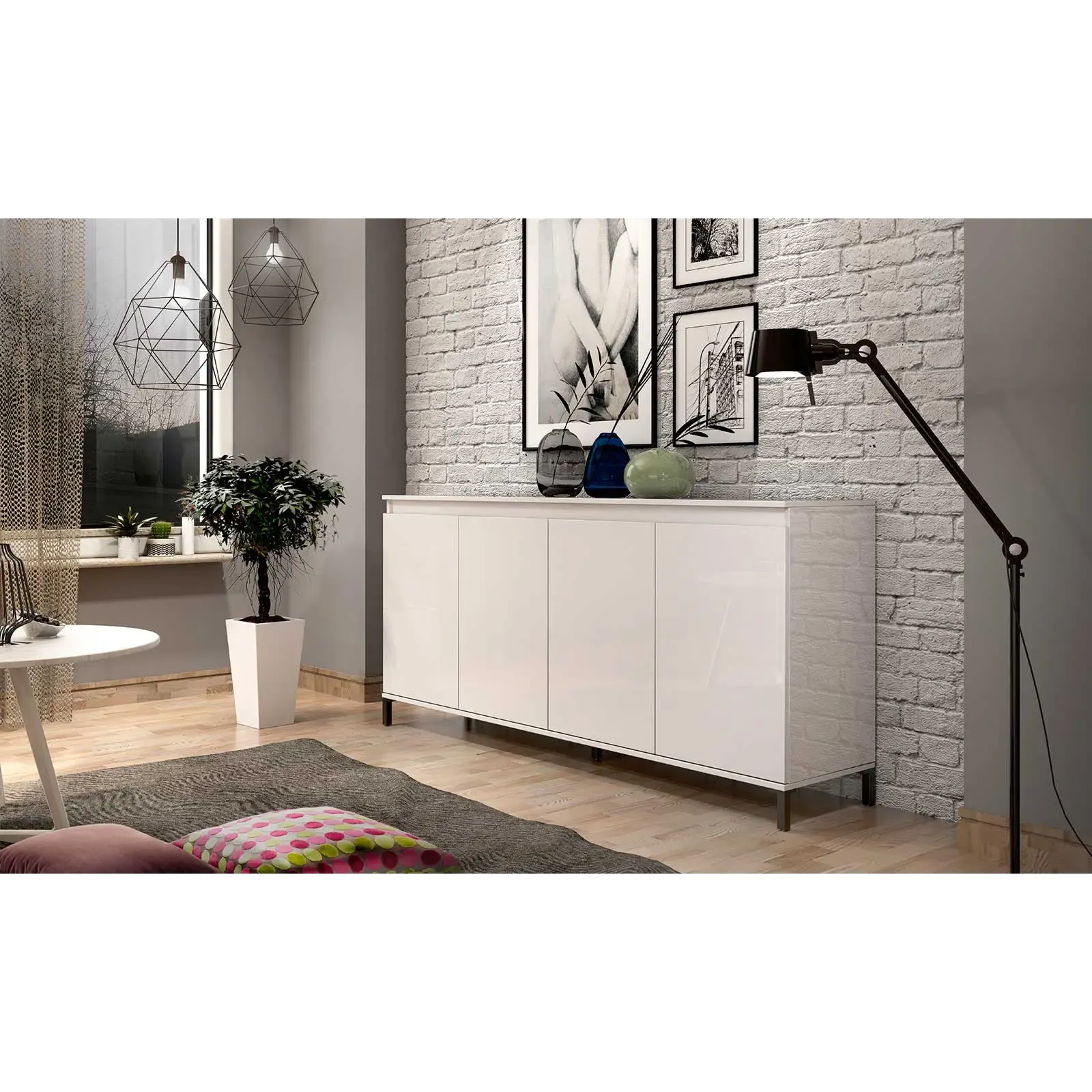 Spaziosa Madia multiuso moderna a 4 ante in finitura Bianca lucida, la credenza è dotata di 4 pratiche ante perfette per posizionare all'interno piatti, bicchieri, calici e mantenere così la vostra sala da pranzo sempre in ordine.