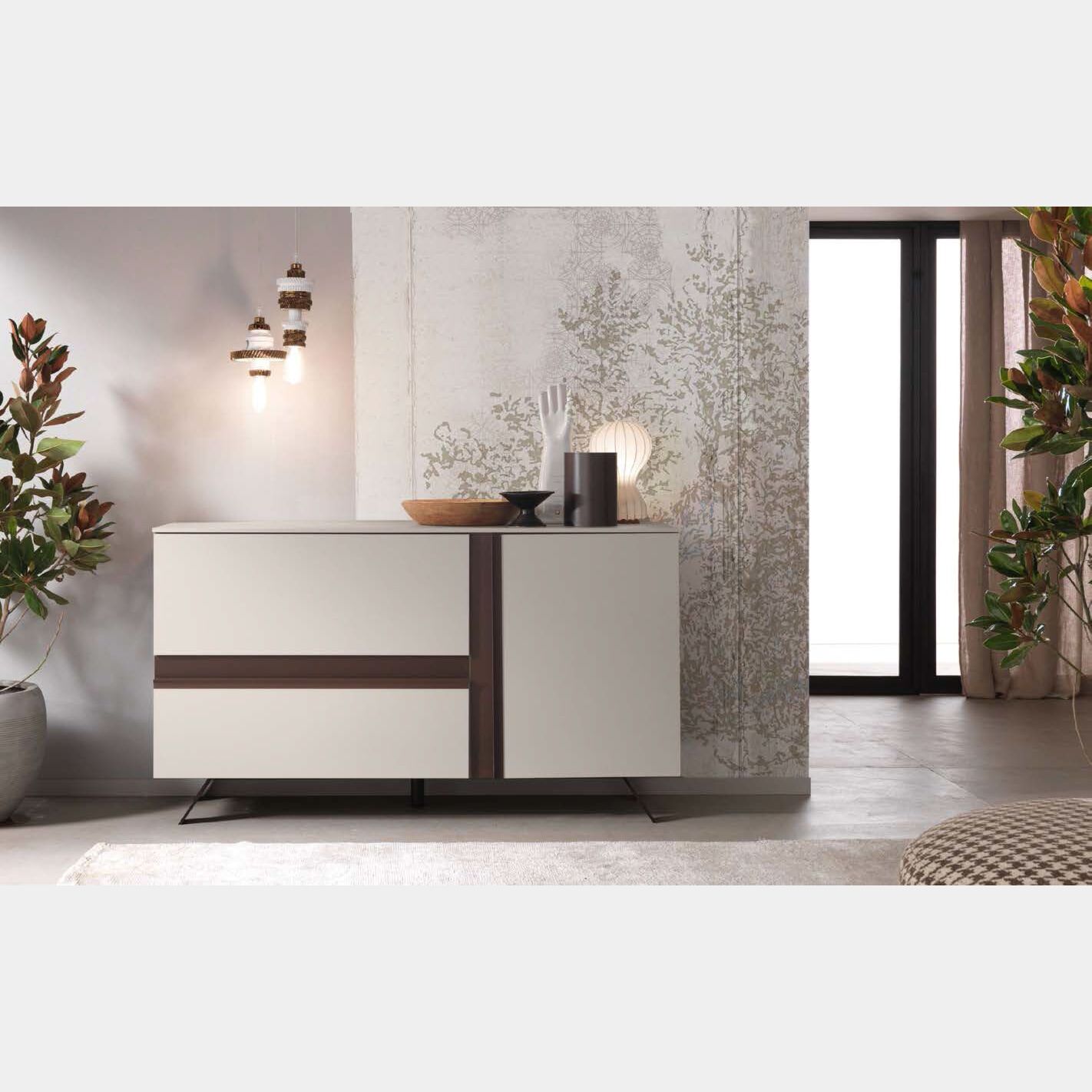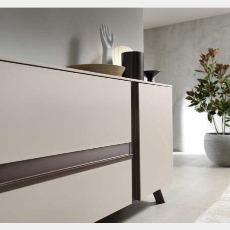 La delicata finitura in Cachemire incontra il Brunito delle maniglie, il contrasto crea un gioco di colori che rende la madia Nakuru elegante e moderna.
