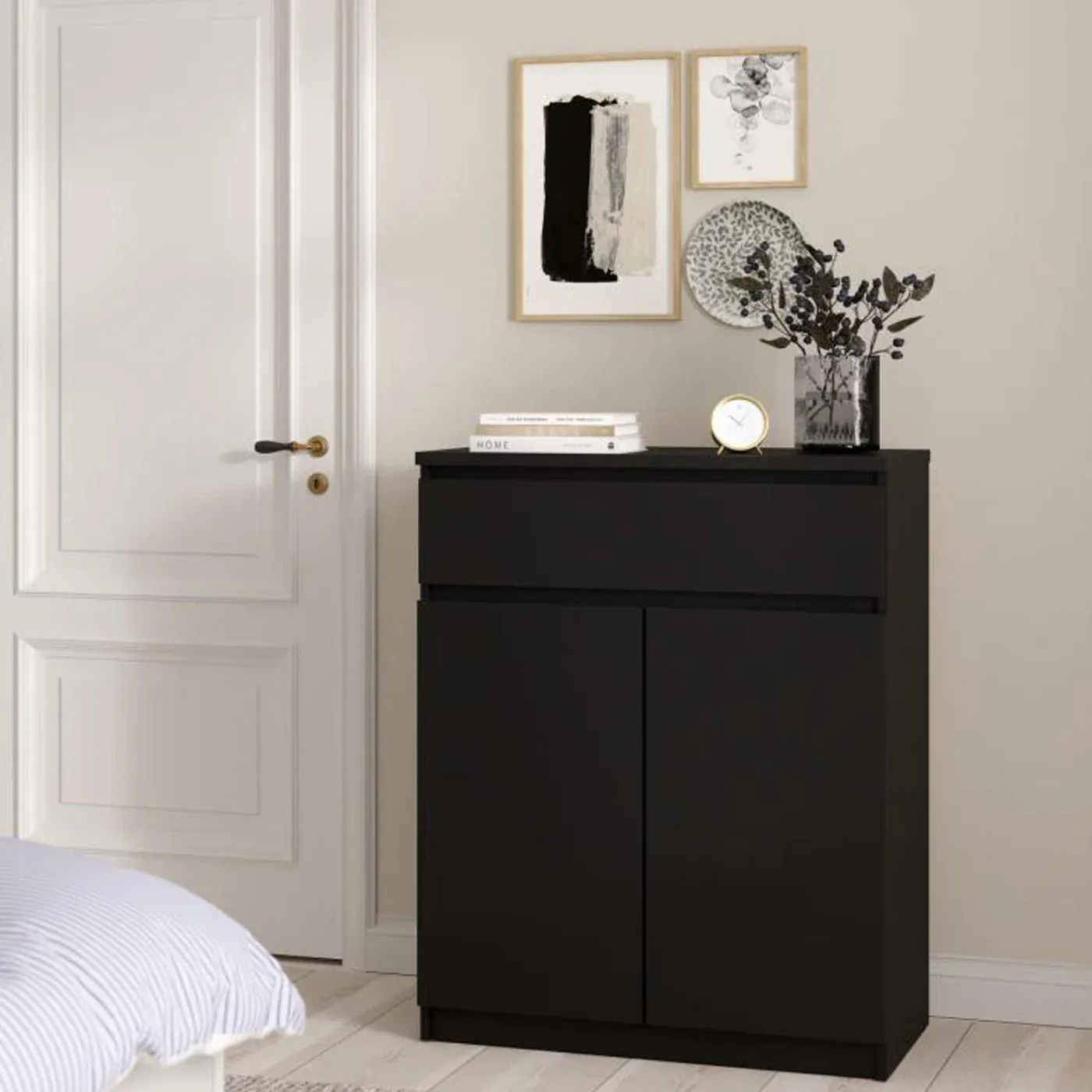 Elegante madia nera dotata di due ante e un cassetto. Grazie al suo design moderno si adatta facilmente a diversi ambienti