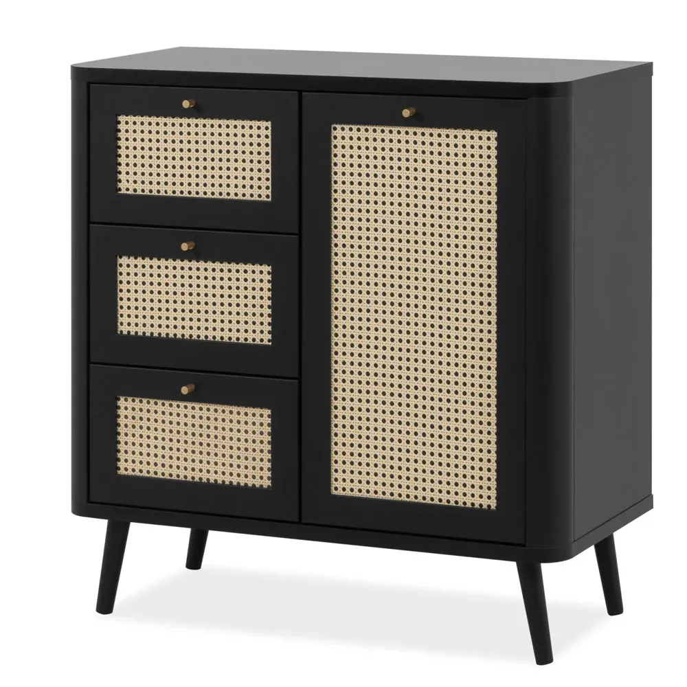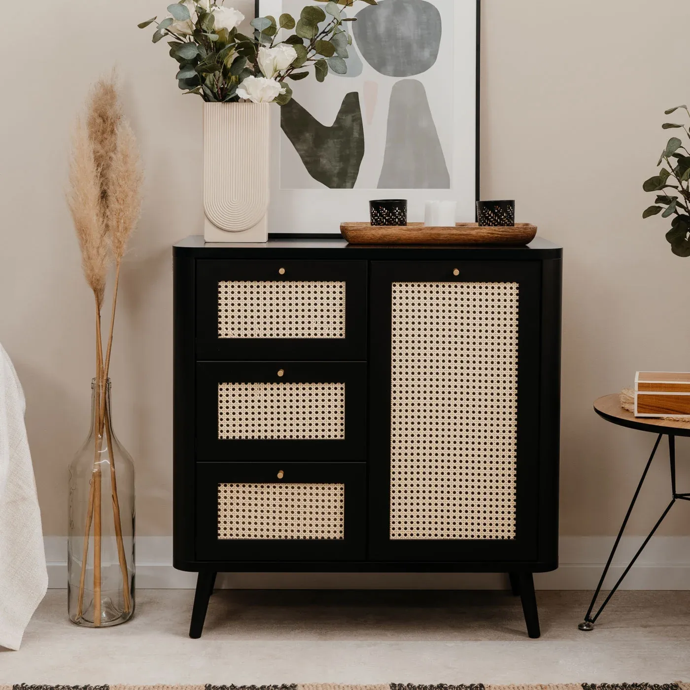 Madia nordica con un anta e tre cassetti colore Nero e Rovere oak effetto rafia. E' disponibile anche in versione Rovere somoa effetto rafia.
