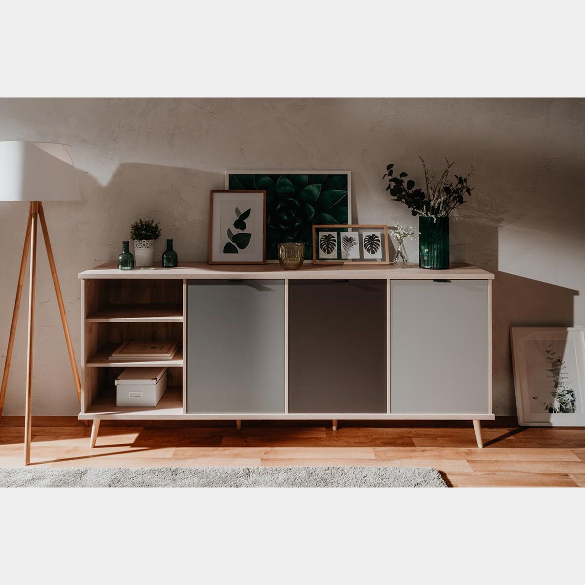 Madia Rosvik con 3 ante e 2 ripiani in finitura Grigio Seta, Grigio Perla e Antracite