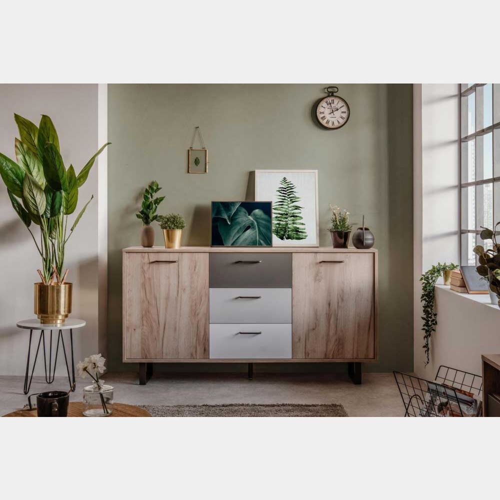 Madia Nordik con gambe in metallo, 2 ante, 3 cassetti, finitura Quercia, Bianco, Grigio e Antracite L 160. Ogni anta è suddivisa internamente da una mensola in legno per ottimizzare al meglio gli spazi. La madia è molto contenitiva e robusta. Questa madia donerà uno stile nordico alla vostra zona living.