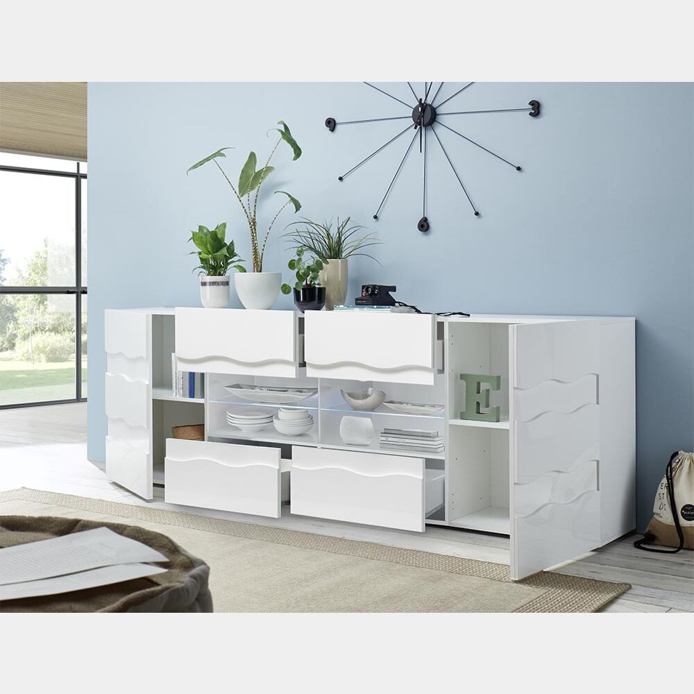 Madia onda a 2 ante 4 cassetti, finitura bianco lucido, design moderno