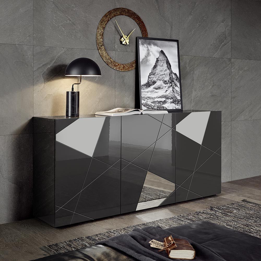 La madia moderna presenta delle serigrafie nelle ante, la particolarità sta negli inserti di specchi lucidi incassati in rilievo. Questi dettagli la rendono estremamente moderna e di tendenza, la finitura in Grigio lucido dona carattere all'ambiente mentre gli specchi riflettono la luce. E' adatta soprattuto a zone ampie come soggiorni o cucine.