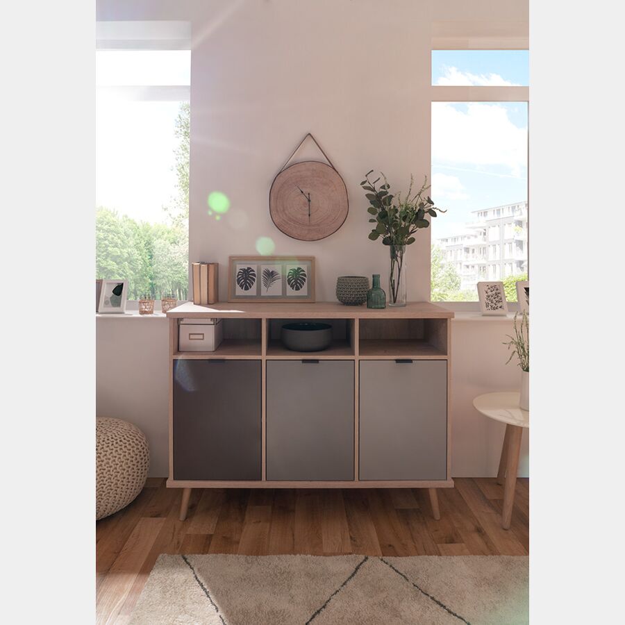 Questa madia è composta da 3 ante in diverse tonalità di grigio e 3 vani a giorno.