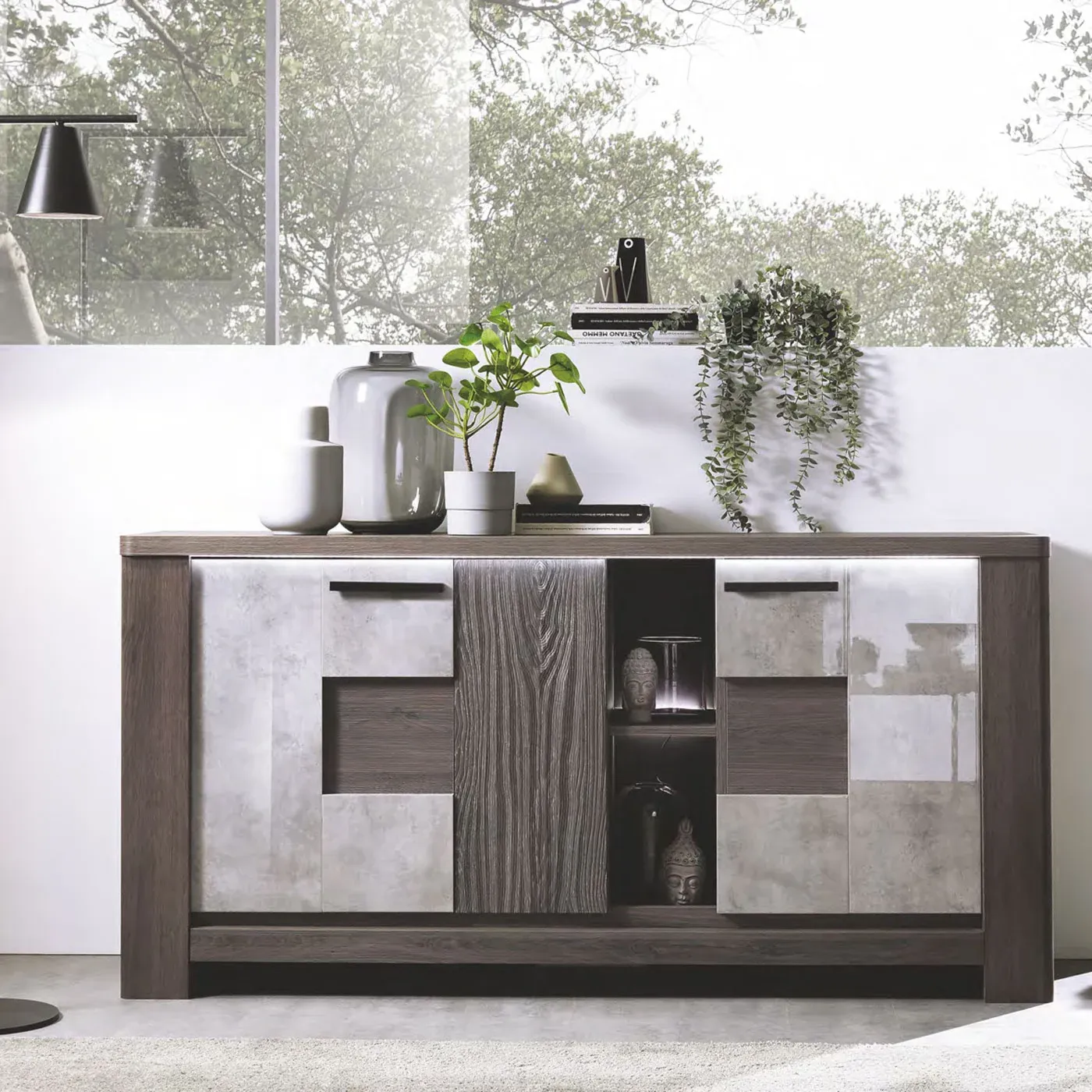 Madia colore Rovere Cenere e Cemento lucido composto da tre ante. I particolari sono in finitura Cemento Bronx lucido.