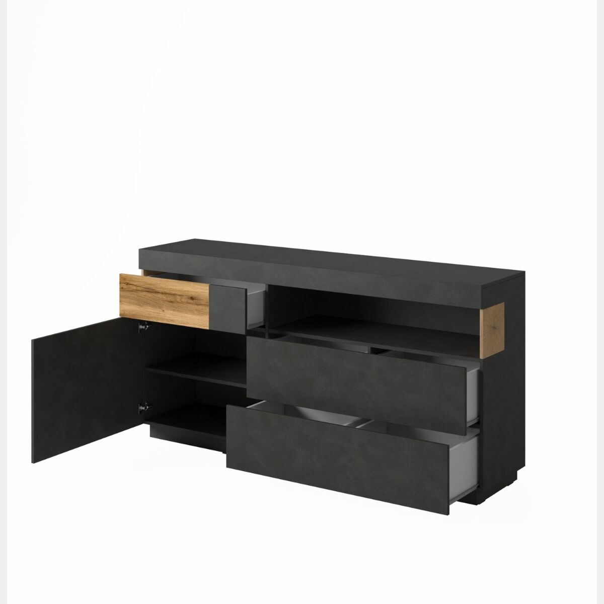 Mobile credenza colore grigio cemento e bianco lucido, larghezza 169 cm, composta da un' ampia anta posizionata sul lato sinistro, 2 cassetti sul lato destro , 1 cassetto più piccolo sul lato sinistro e un comodissimo vano a giorno.