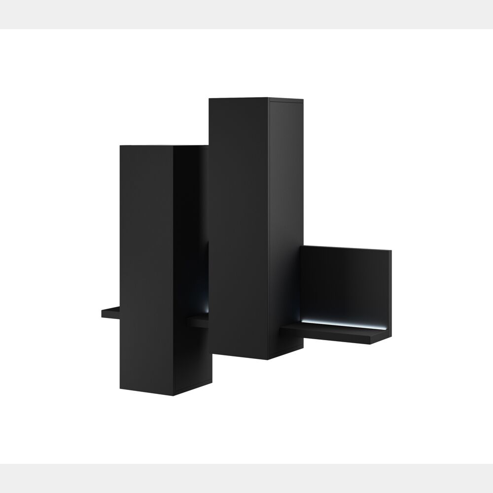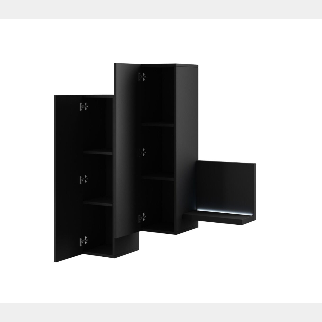 Modulo porta oggetti nero opaco, formato da una mensola e 2 pensili verticali
