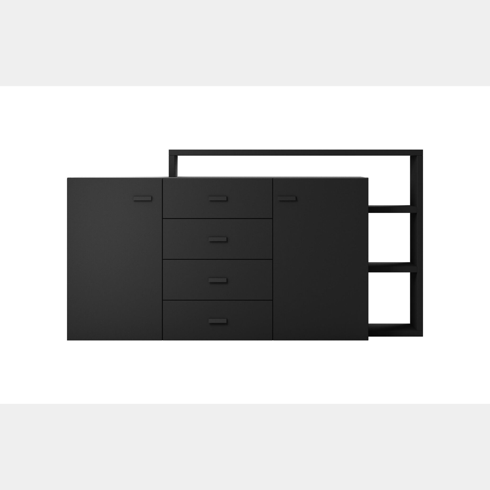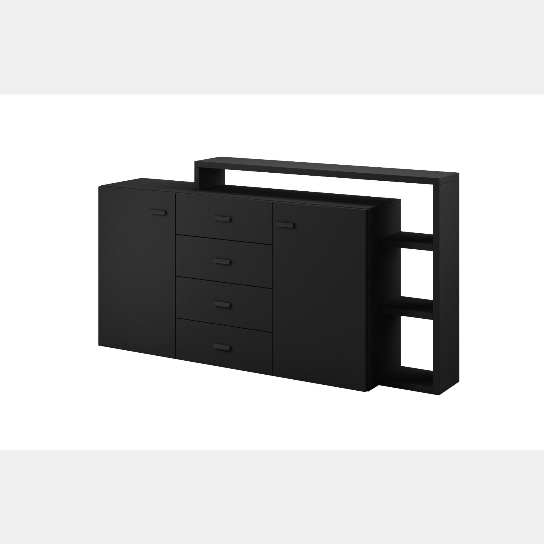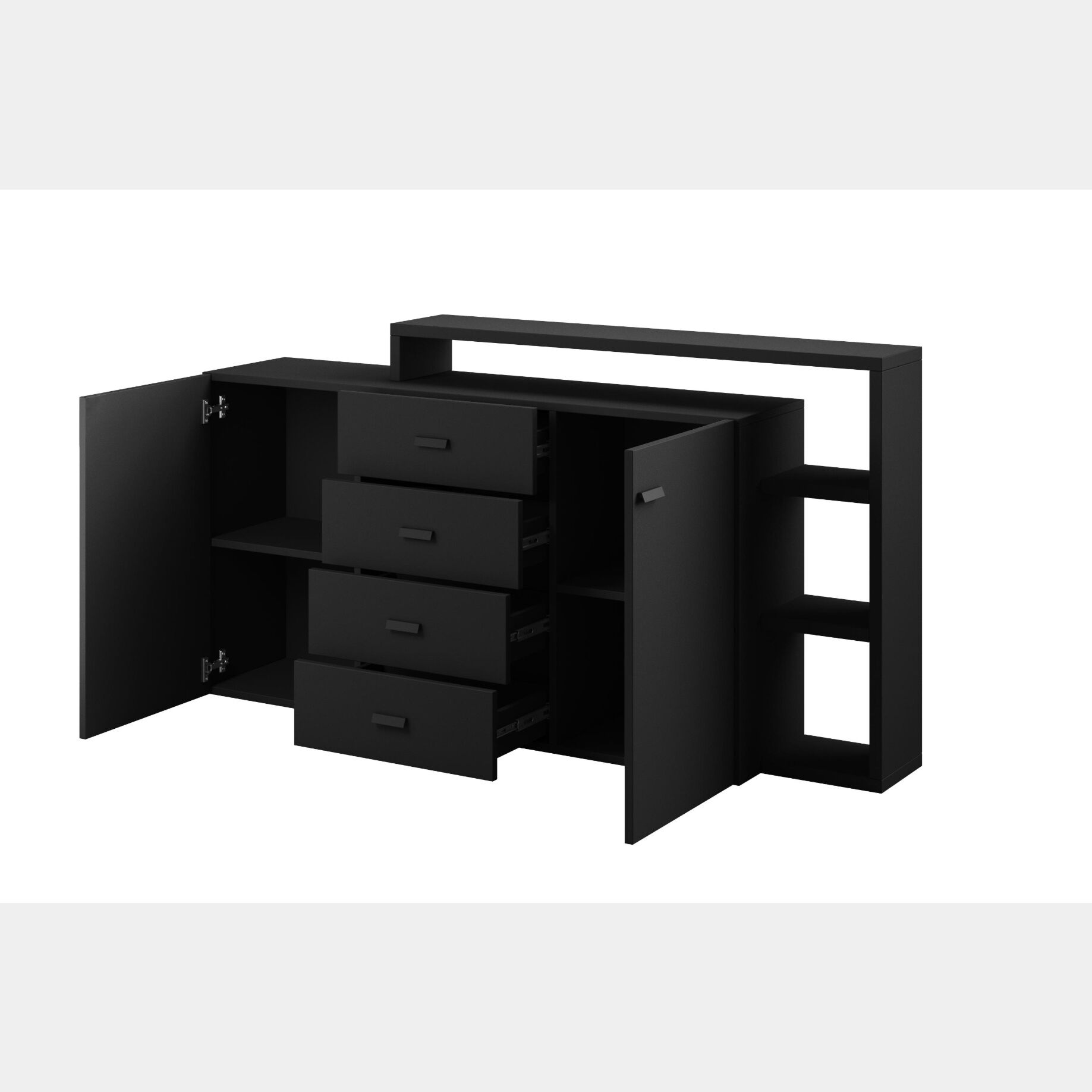 La credenza nera opaca è dotata di 2 ripiani interni, vani a giorno laterali e 4 pratici cassetti perfetti per sfruttare al meglio lo spazio. E' dotata inoltre di partiche maniglie, che donano un tocco di classe a qualsiasi tipo di soggiorno.