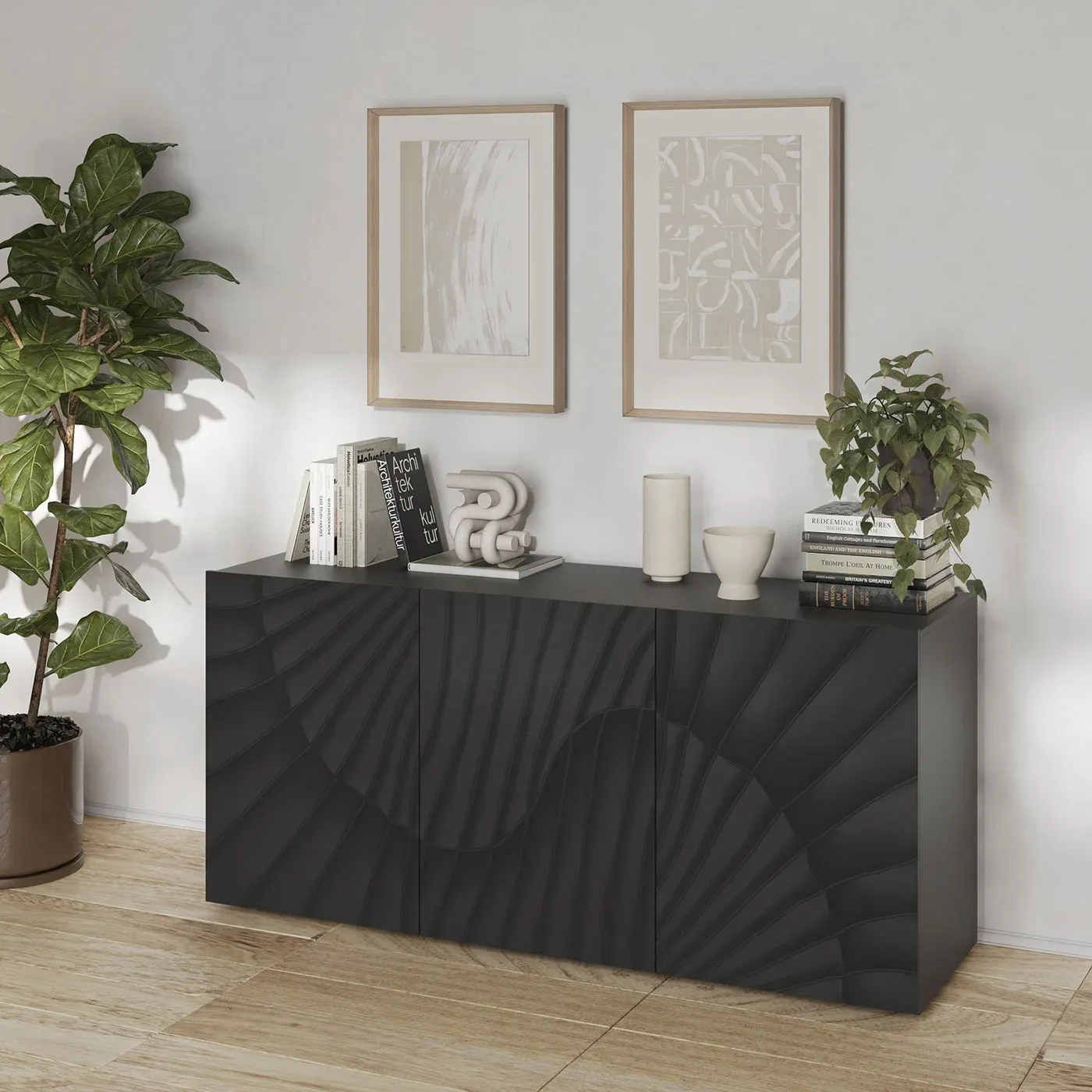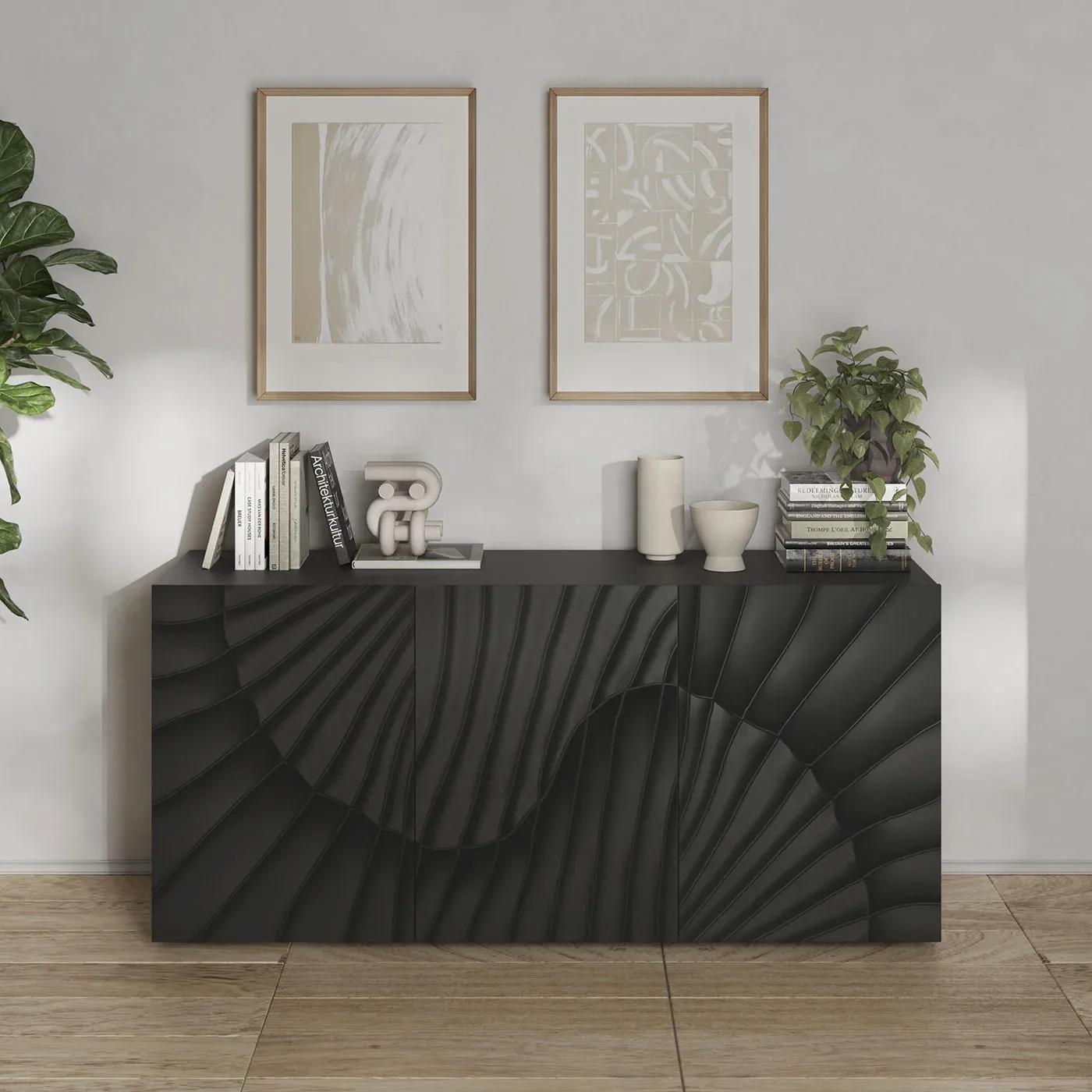 Perfetta per soggiorni e ingressi la madia offre la massima praticità, offrendo al contempo un arredo ricercato. Il disegno serpentiforme sui frontali la rende una soluzione d'arredo peculiare e di gran gusto.