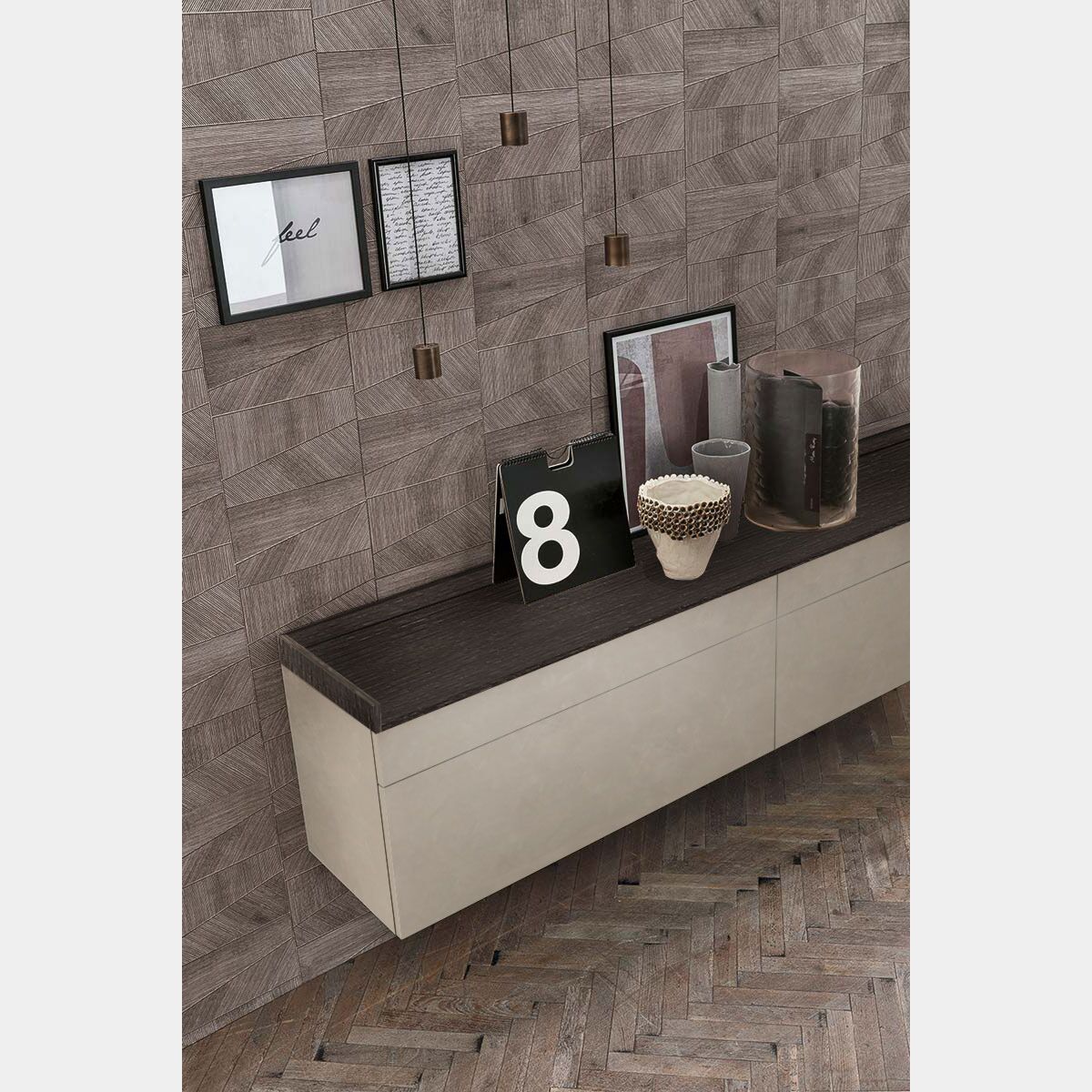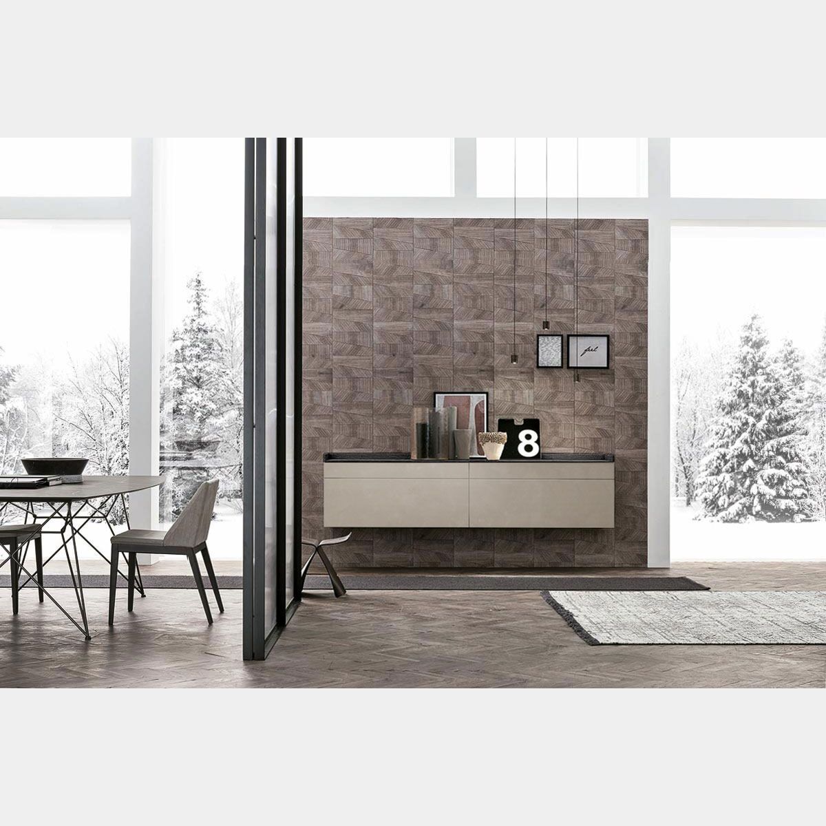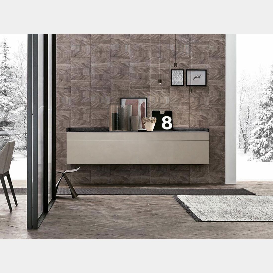 La madia presenta un design leggero e moderno, caratterizzata da neutre finiture dalla differente texure assicura al living un'inconfondibile stile, capace di donare personalità e carattere all'ambiente. L'ampia gamma di finiture assicura una completa personalizzazione della madia per assicurare ad ognuno il complemento d'arredo perfetto per il proprio soggiorno.