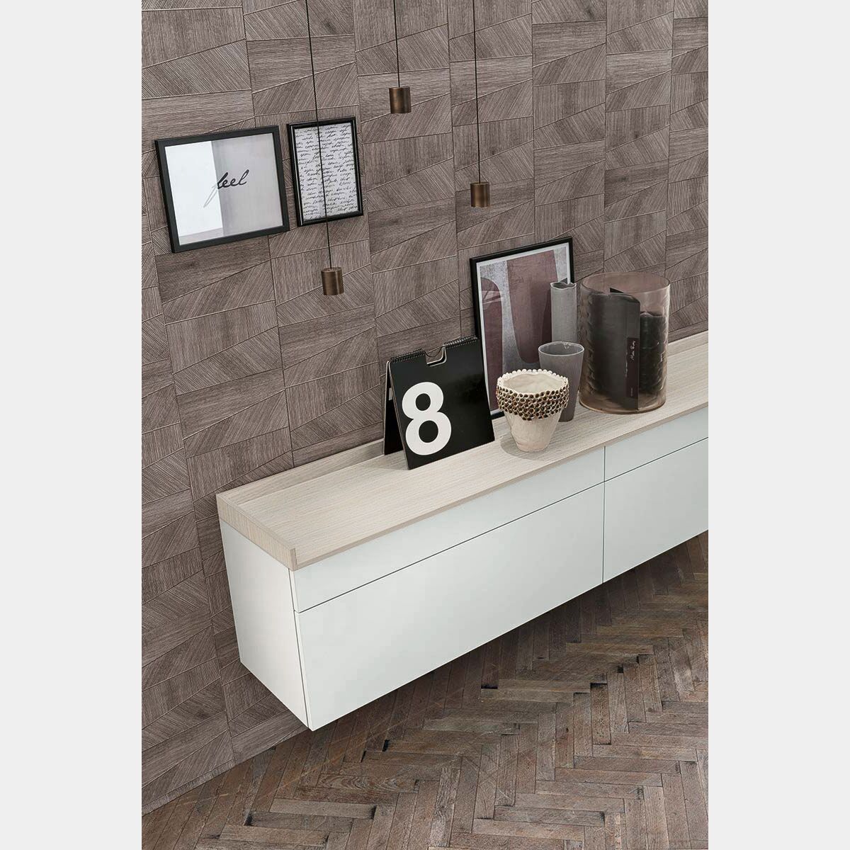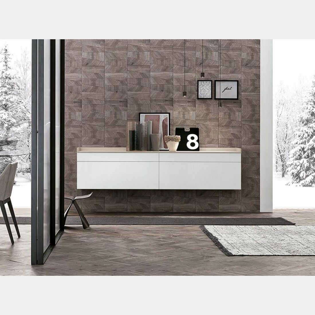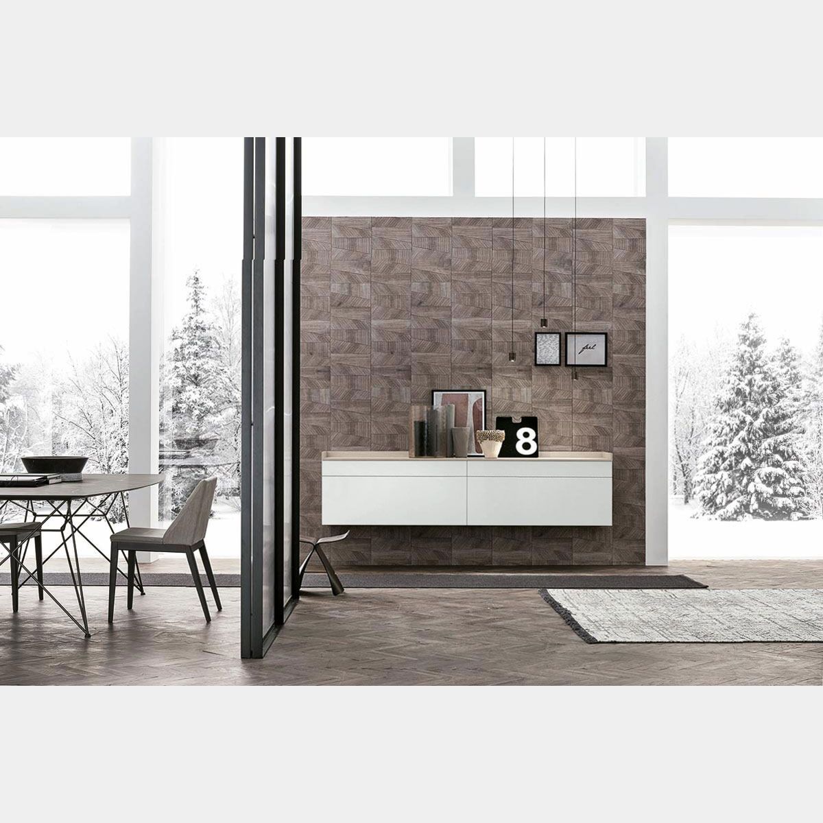 La madia presenta un design leggero e moderno, caratterizzata da neutre finiture dalla differente texure assicura al living un'inconfondibile stile, capace di donare personalità e carattere all'ambiente. L'ampia gamma di finiture assicura una completa personalizzazione della madia per assicurare ad ognuno il complemento d'arredo perfetto per il proprio soggiorno.