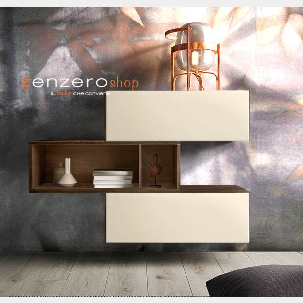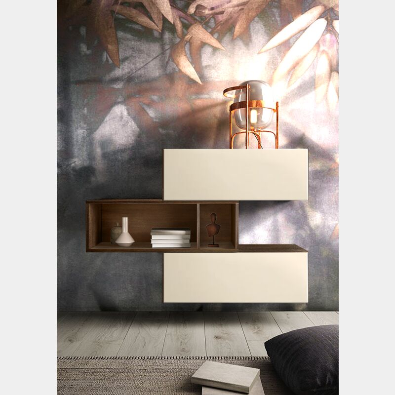 La madia sospesa è dotata di 2 elementi a ribalta e un elemento a giorno che crea 2 vani.