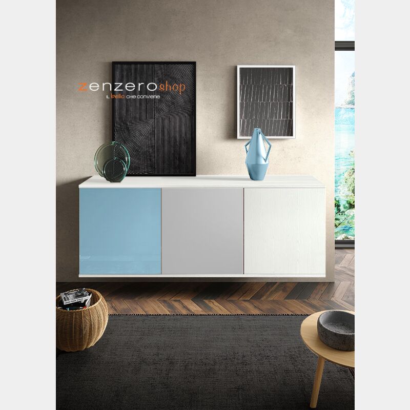 Madia sospesa Spe con 3 ante in finitura Frassinato bianco, Vetro azzurro e Grigio opaco