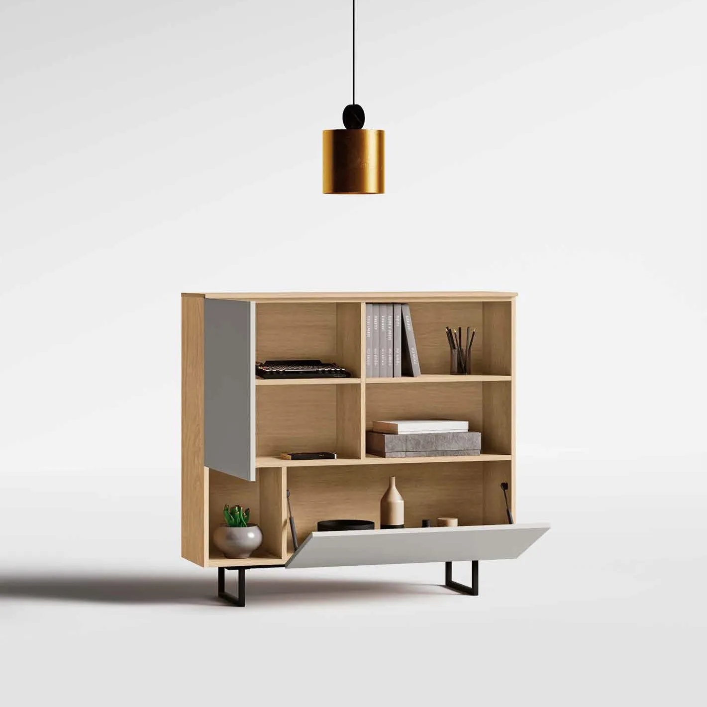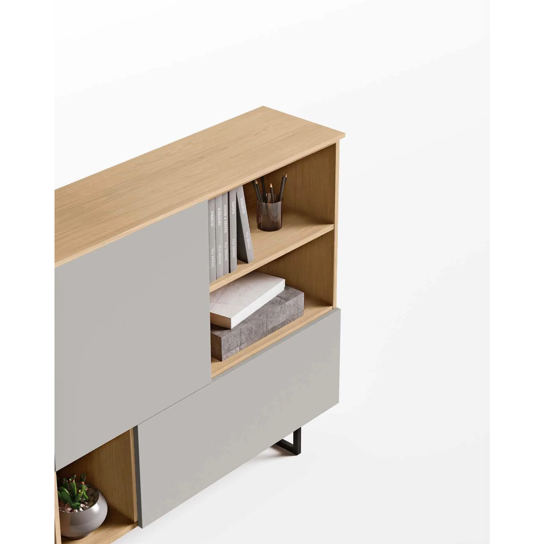 Madia stretta con piedi in ferro, finitura Rovere nordico e Grigio seta