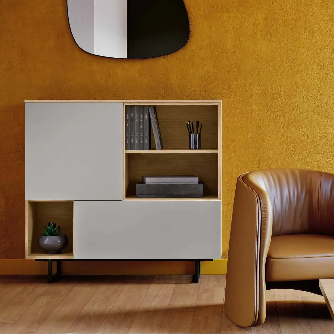 In tema di equilibri, l'accostamento di finiture differenti per tinta e materialità crea un prezioso arredo, capace di personalizzare ingressi, living e cucine.