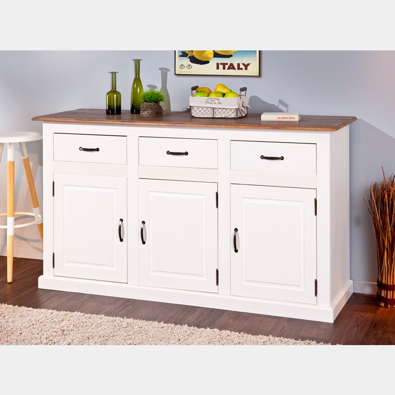 Questa elegante credenza in legno massiccio di pino bianco si presta all'arredo del soggiorno, ed è composta da tre ante battenti decorate e tre cassetti, tutti provvisti di maniglie per l'apertura.