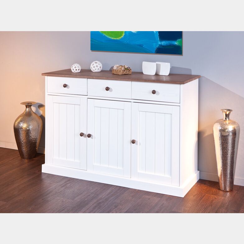 Questa elegante credenza in legno massiccio di pino bianco si presta all'arredo del soggiorno, ed è composta da tre ante battenti decorate e tre cassetti, tutti provvisti di pomelli per l'apertura.