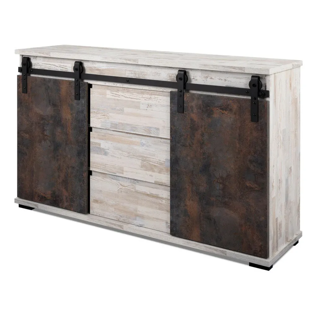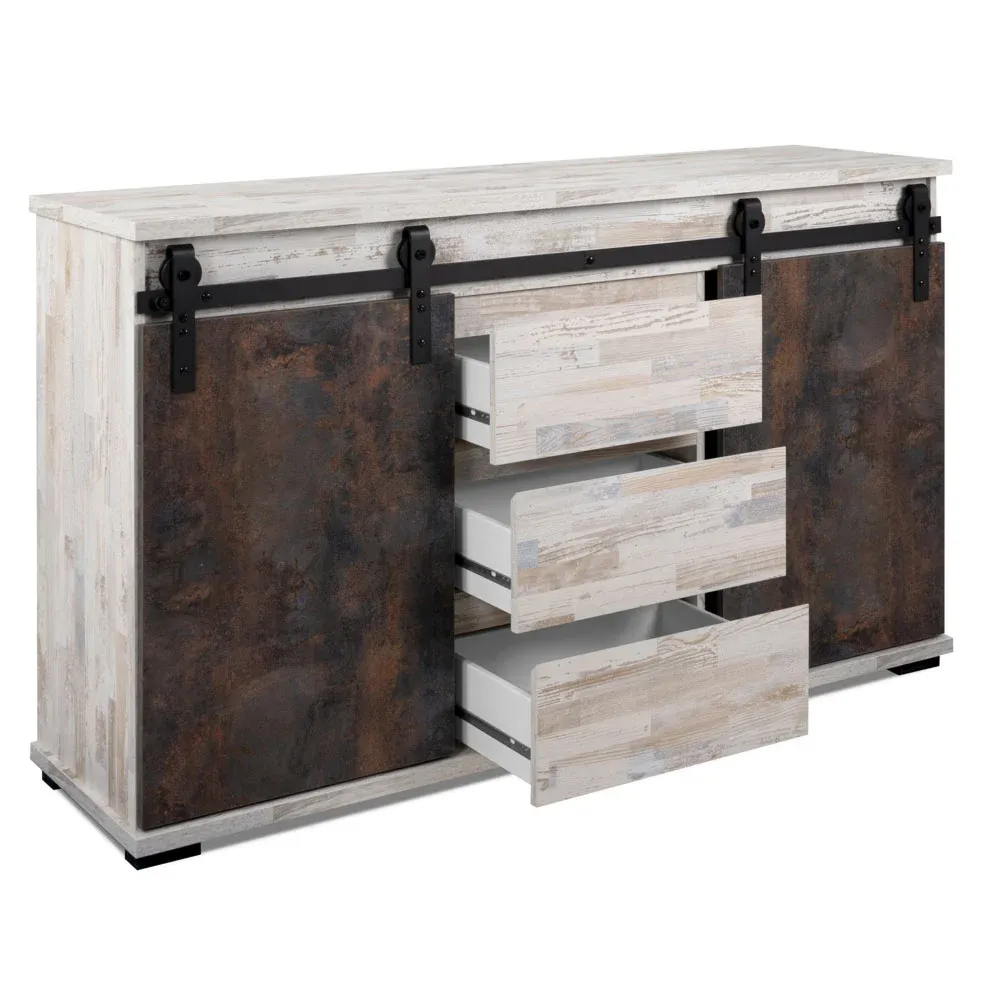 La madia è nella finitura Willow e Acero invecchiato, presenta 2 ante scorrevoli con 2 ripiani interni e 3 cassetti centrale, offre un ampio spazio di appoggio e risulta pratica e funzonale.