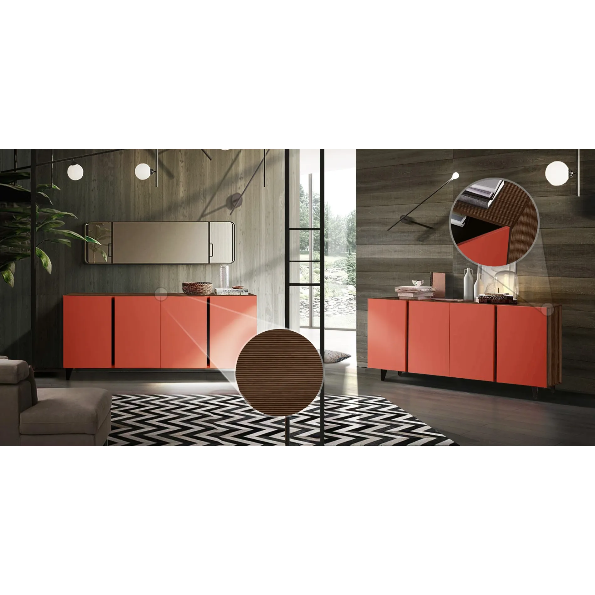 La madia moderna a quattro ante, proposta da Zenzero Shop, presenta una struttura in effetto cannettato, mentre i frontali sono di un intenso color Corallo.