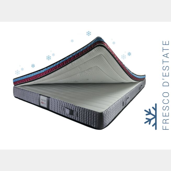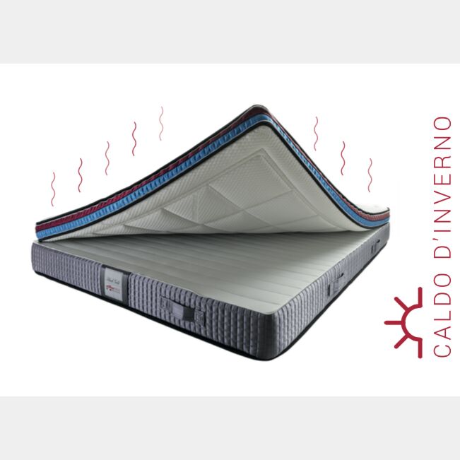 Materasso innovativo di ultima generazione con sistema brevettato "fresco d'estate" e "caldo d'inverno" composto da 2 materassi in 1. Il materasso superiore è un topper doble face con un lato estivo e uno invernale.