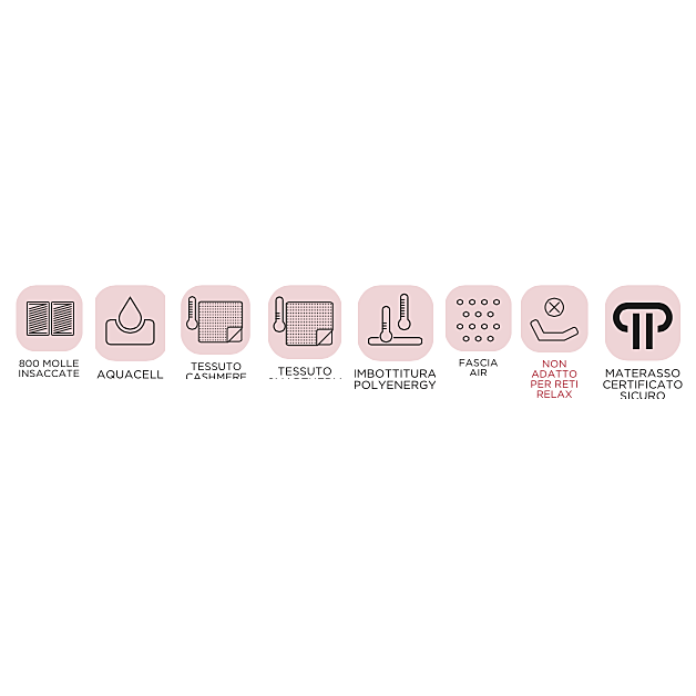 La parte inferiore del materasso è composta da 800 molle insacchettate a movimento indipendente, con 5 zone di portata differenziata, carenatura perimetrale anti-affossamento "Elast Box System".