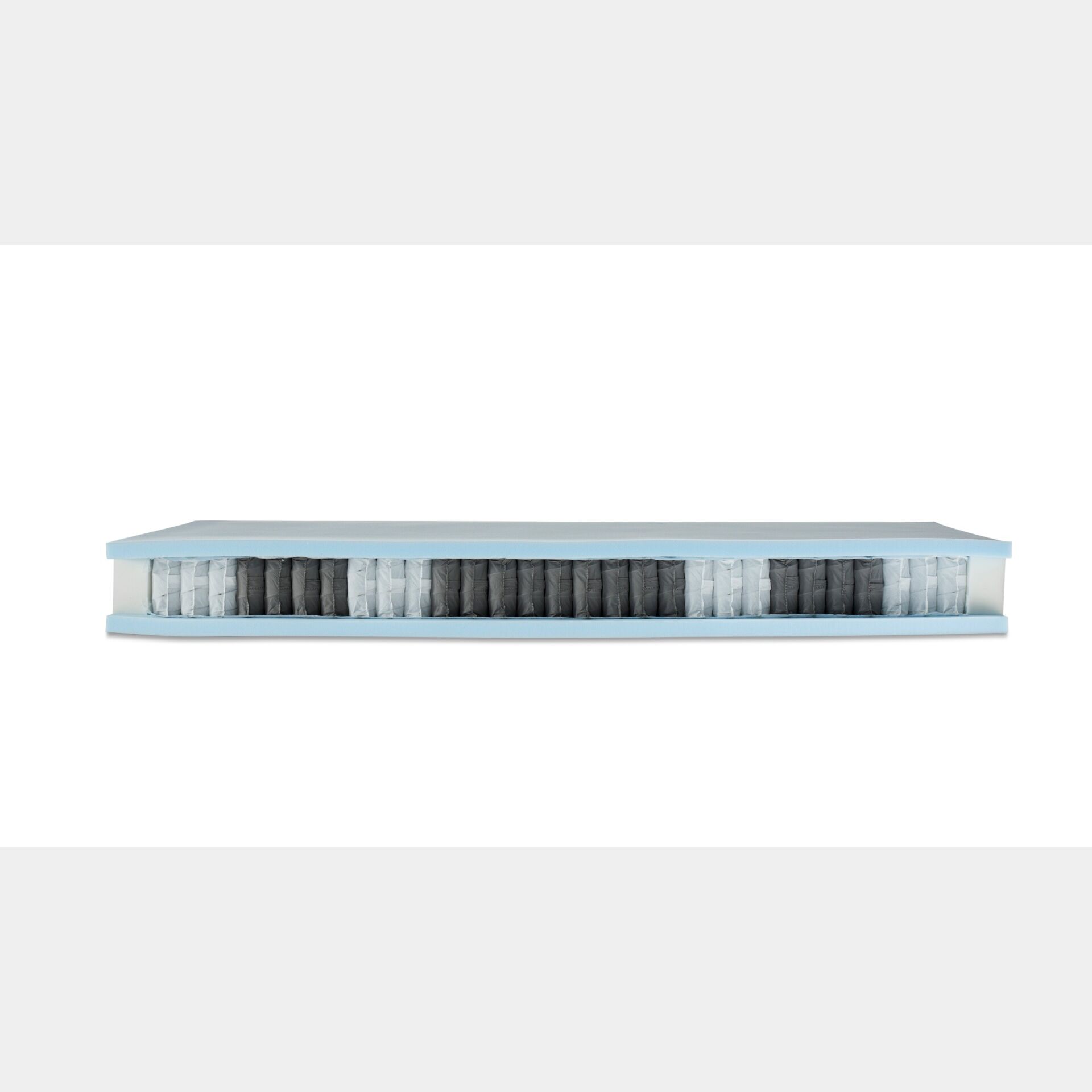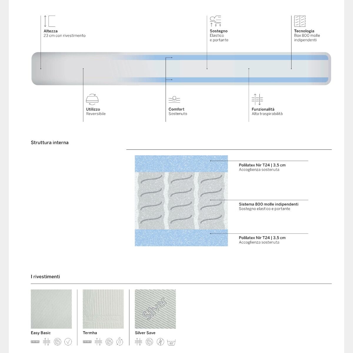 E' un materasso dal comfort equlibratamente sostenuto che, grazie al sistema di 800 molle indipendenti, sostiene il peso corporeo con precisione trasmettendo immediatamente il senso di un sostegno equilibrato, senza punti di pressione. Il materasso ha un'altezza di 23 cm (con rivestimento), 19 l'interno così suddiviso