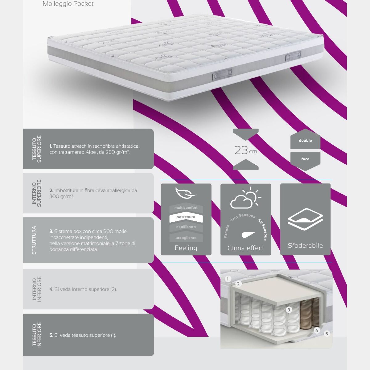 ➡️ Struttura: l'innovativo sistema Molleggio Pocket migliora la performance di accoglienza. La tecnologia delle molle insacchettate e indipendenti, grazie ad un maggior numero di molle, genera una reazione indipendente e consente una risposta microdifferenziata alle diverse zone del corpo. L'effetto complessivo percepito durante il riposo è incredibilmente rilassante e rigenerante, un'esperienza di comfort del tutto nuova rispetto ai tradizionali sistemi a molle.