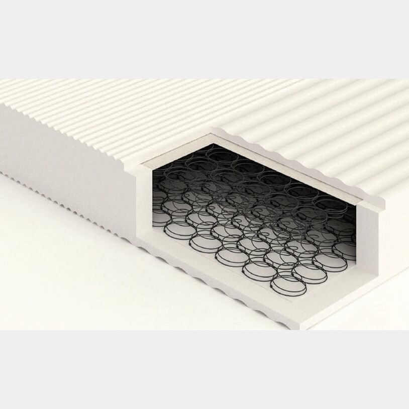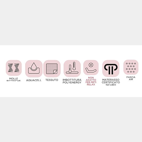 E' realizzato con una struttura interna a molle biconiche Bonnell 400 e ricoperto da uno strato di Acquacell da 3 cm rinfrescante e massaggiante sulla pelle.