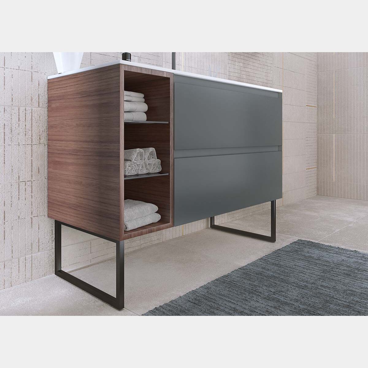 Il mobile da bagno con piedi presenta un design semplice e moderno, caratterizzato dall'accostamento di due finiture che differiscono sia per texure che colorazione. Il Grigio basalto opaco viene valorizzato dal vano a giorno con ripiani in vetro in Noce canaletto, l'accostamento genera un piacevole contrasto che personalizza l'ambiente.