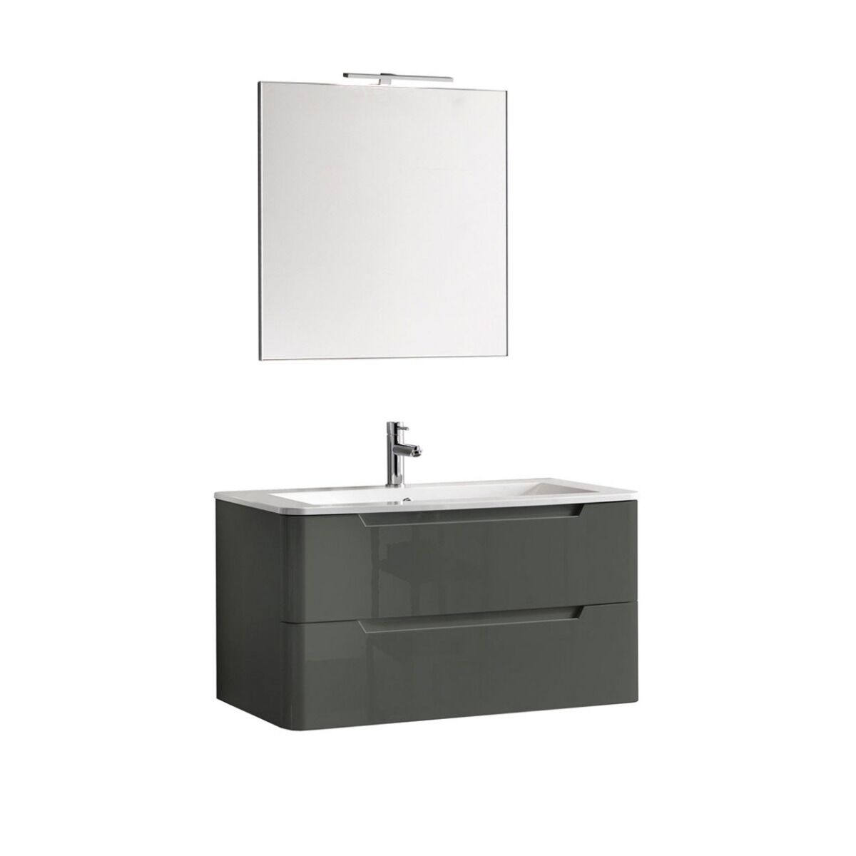 Il mobile di design è composto da una base da bagno sospesa in finitura Grigio laccato lucido ed ha 2 cassettoni centrali sagomati e dotati di maniglia a gola e completi di chiusura soft-close. Lo specchio invece ha un telaio a vista color argento. La composizione è anche provvista di lavabo in resina con foro troppopieno e una lampada led con caratteristiche: 6000k (non sostituibile), 8W, AC220/240V, 50-60Hz, 640 Lumen, IP44, RoHS, CE, classe energetica A++
