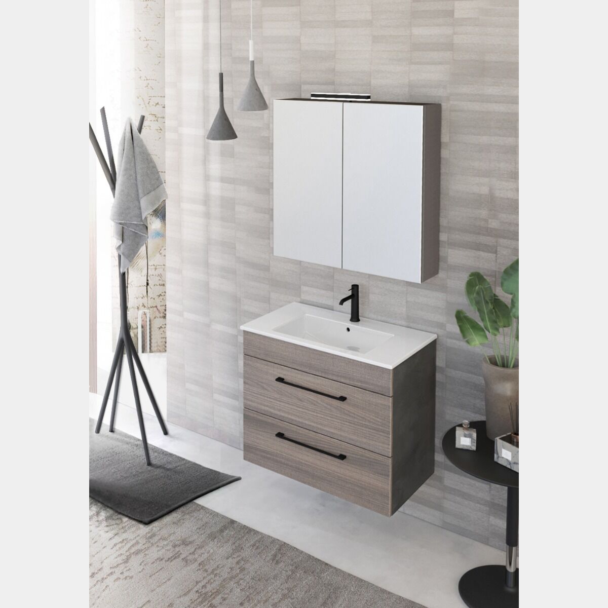 Il mobile da bagno viene fornito con il lavabo integrato in ceramica nella finitura bianco lucido con troppopieno e foro miscelatore. In aggiunta è possibile richiedere il pensile specchio contenitivo con anta a specchio battente in finitura interna Telato Antracite, e fianchi esterni in finitura Metal Grafite, dotato di 2 ripiani in cristallo e cerniere in metallo regolabili (alto-basso-larghezza-profondità) con chiusura ammortizzata (optional) e la lampada con illuminazione LED a basso consumo di energia, IP 44, potenza 8W (optional).