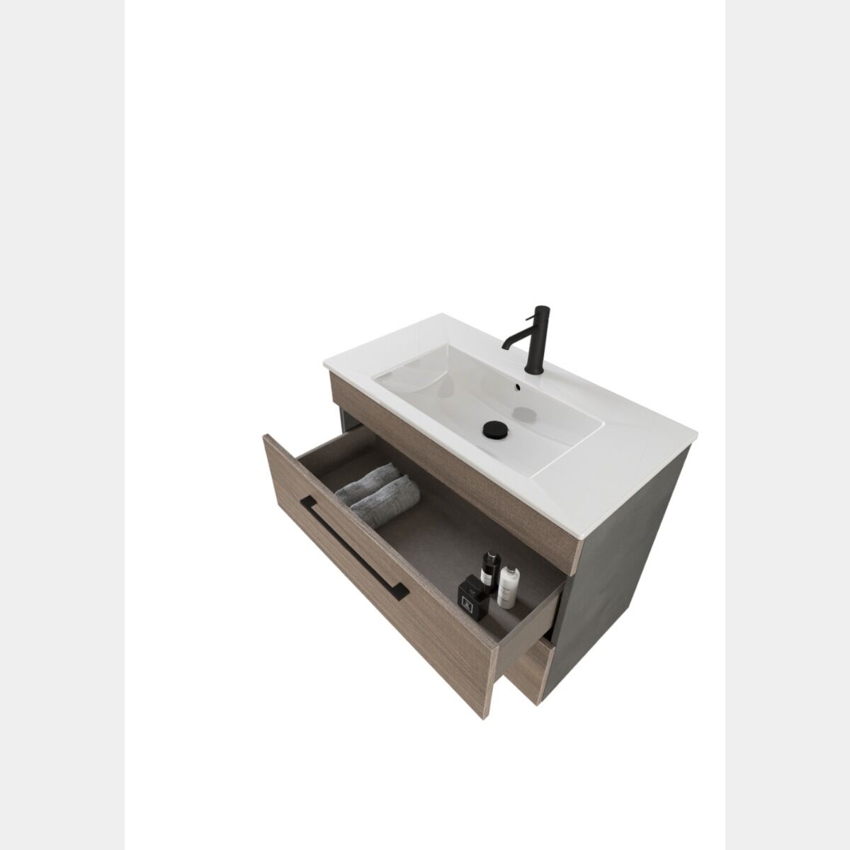 Il mobiletto bagno è realizzato con pannelli in agglomerato di legno con superficie in lamina melaminica in finitura Medium elm con fianchi in Cemento grigio lava (texure in rilievo), è dotato di 2 cassetti con guide di scorrimento metalliche e apertura e chiusura ammortizzata ad estrazione totale, regolabili in alto/basso.