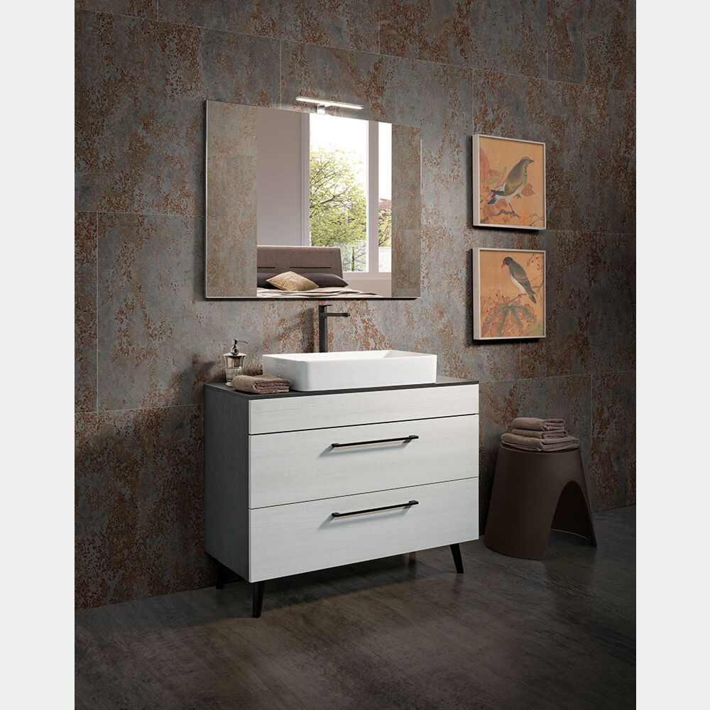 La struttura si presenta con la finitura in Cemento grigio lava.Alla consolle è possibile aggiungere il lavo in appoggio in finitura bianco lucido (optional), lo specchio rettangolare larghezza 100 cm altezza 75 cm supportato su pannello struttura in agglomerato di particelle di legno con lamina melaminica in finitura Telato Antracite (optional), la lampada con illuminazione LED a basso consumo di energia, IP 44, 220V (optional).