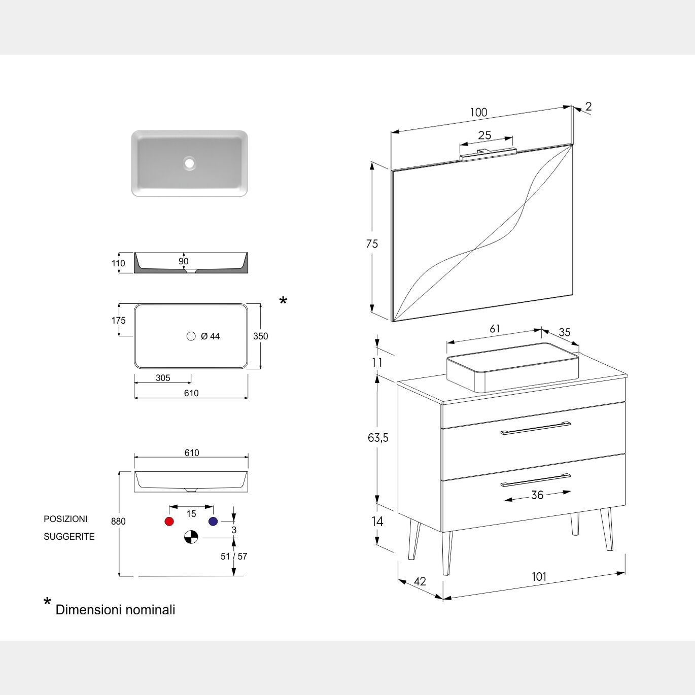 - Lavabo: L.61 H.11 P.35 (optional)