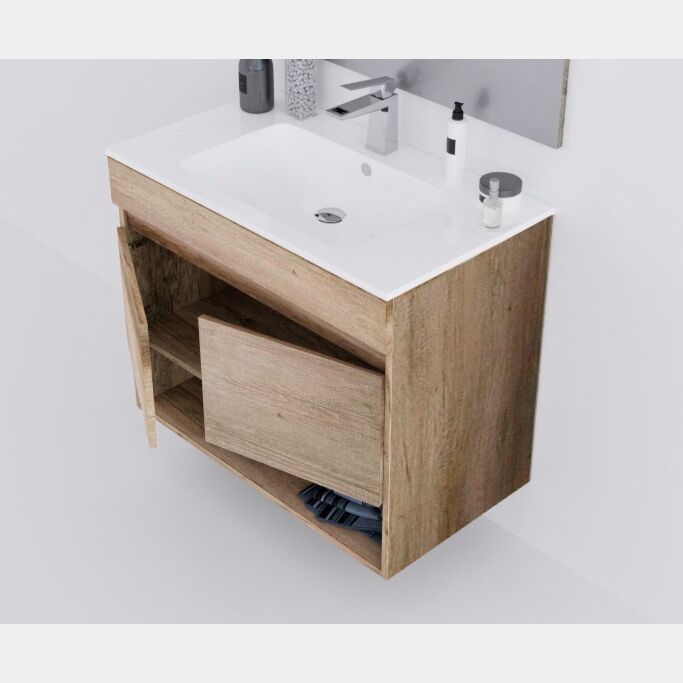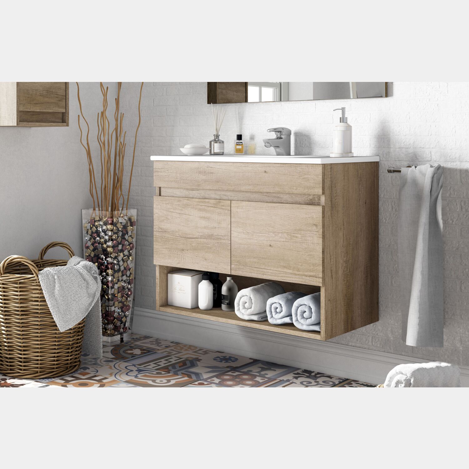 Composizione bagno composta da mobile sospeso con 2 ante battenti. Finiture rovere norik.