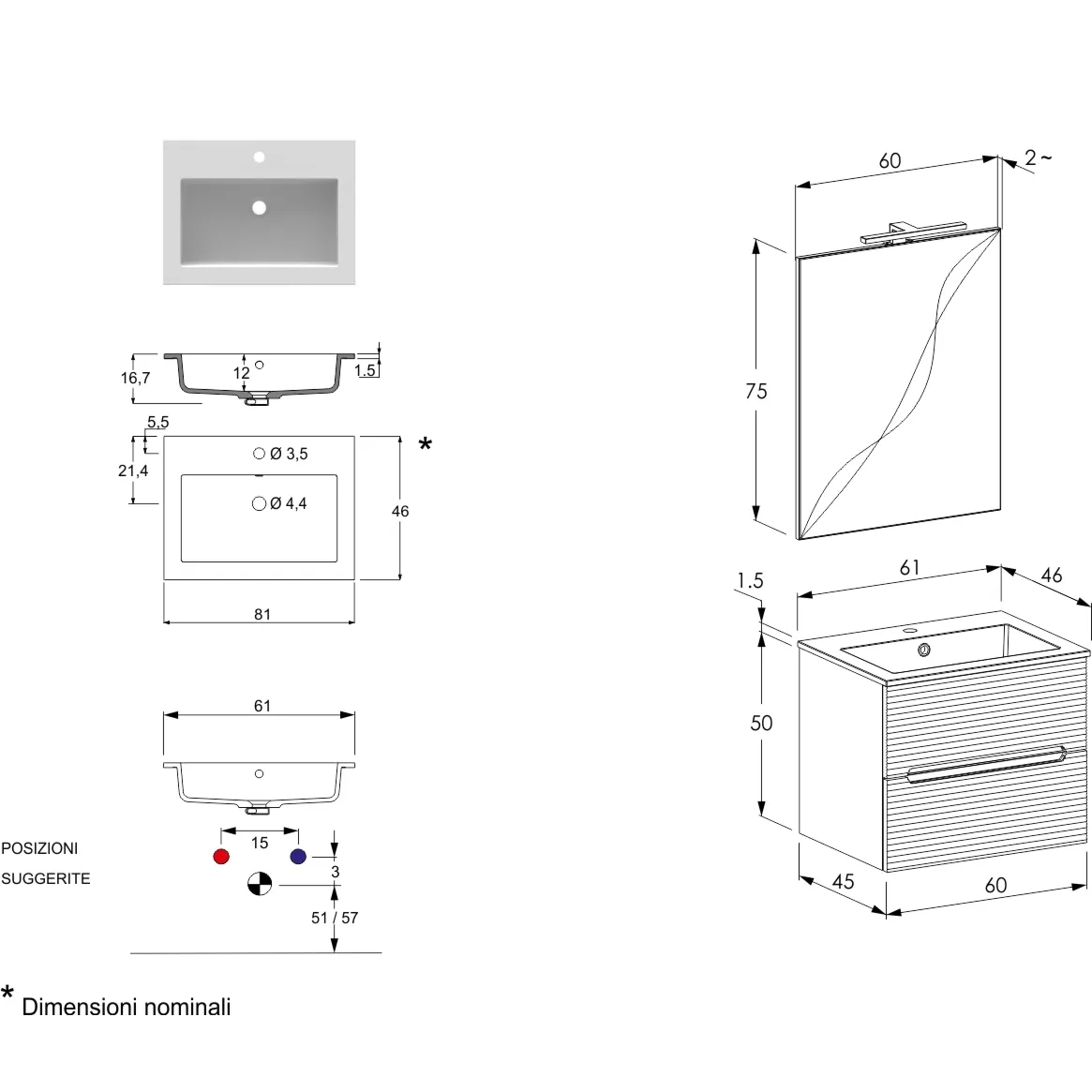 Progettato per bagni dalle dimensioni limitate il mobile risulta un perfetto compromesso tra capienza e ingombro. I due capienti cassetti assicurano la massima praticità nel quotidiano.