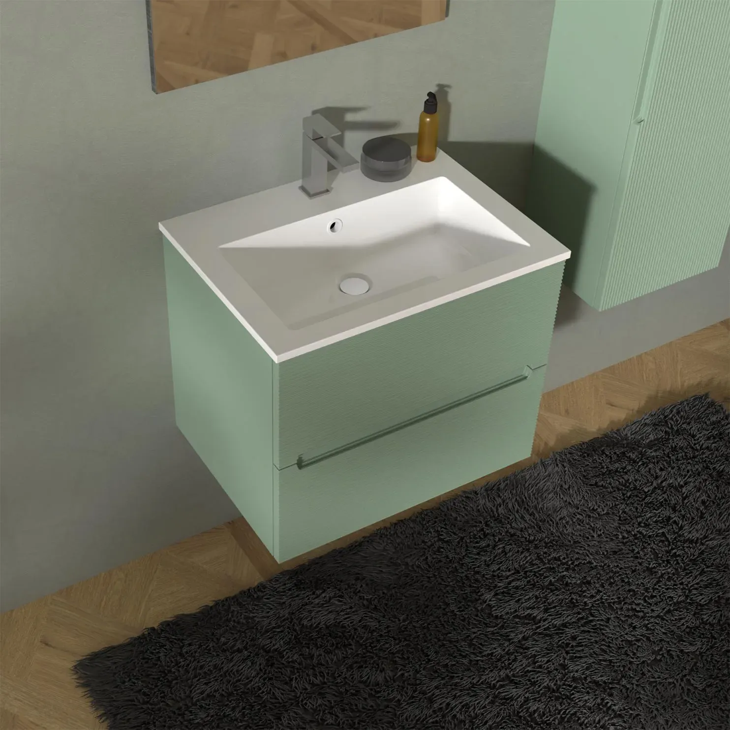 I frontali sono rigati ed hanno maniglia integrata, caratteristica che conferisce al mobile una linea moderna ed elegante che viene completata dalla finitura Verde salvia.