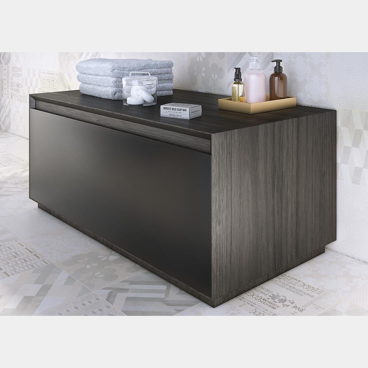Il cassetto è dotato di meccanismo di apertura push-pull, l'interno è in finitura tessuto color antracite. Cassetti con sponde in metallo antracite e fondo effetto pelle. Il mobile a terra è proposto in due finiture: wengè grigio per struttura e Nero opaco per frontale. La struttura del piano viene proposta in finitura anticato bronzo mentre il piano è in stonelight nella tonalità Iron.