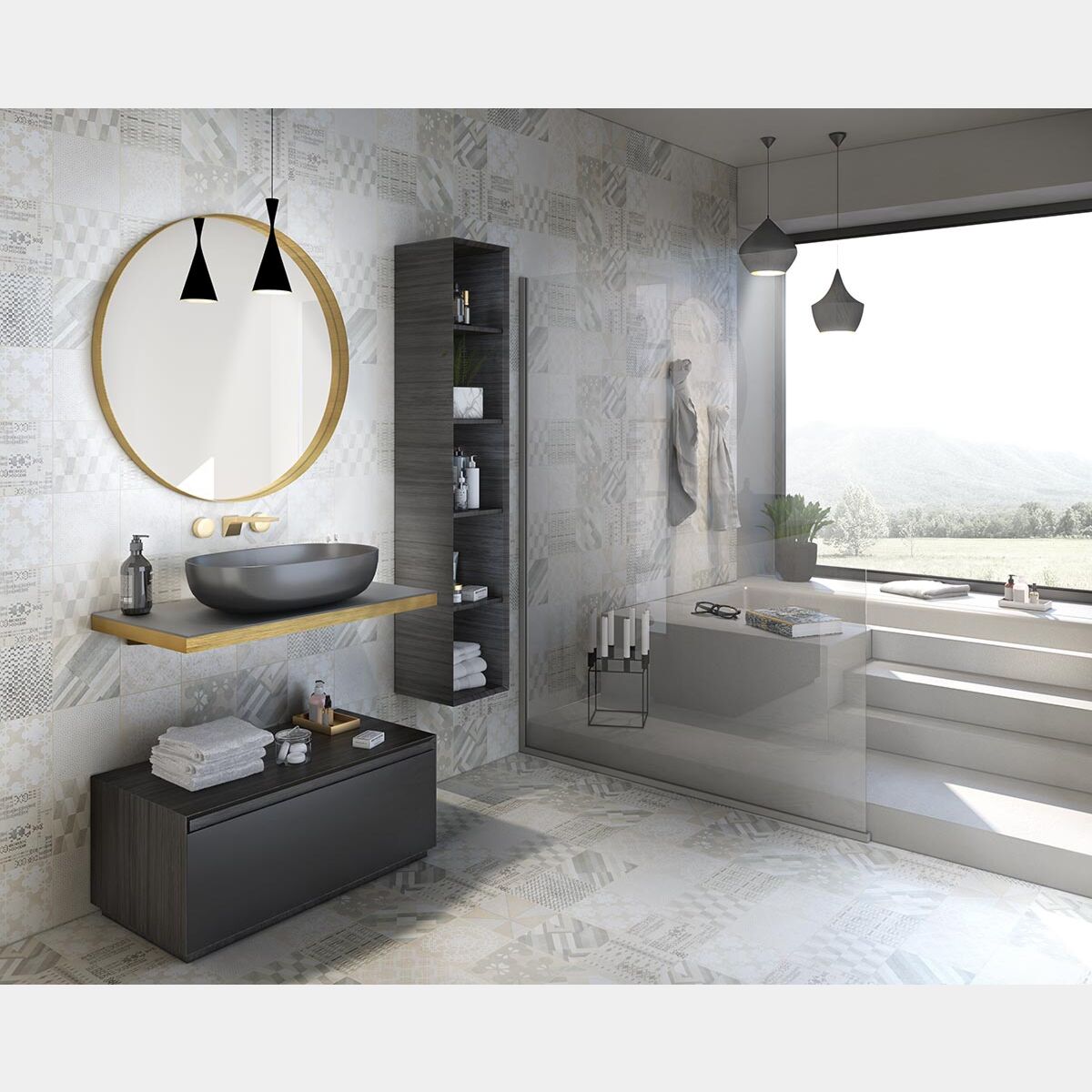 Il mobile da bagno è composto da un elemento con cassetto che poggia a terra ed un top superiore che sostiene il lavabo in appoggio. Tramite apposito configuratore è possibile richiedere la colonna sospesa laterale e lo specchio tondo.