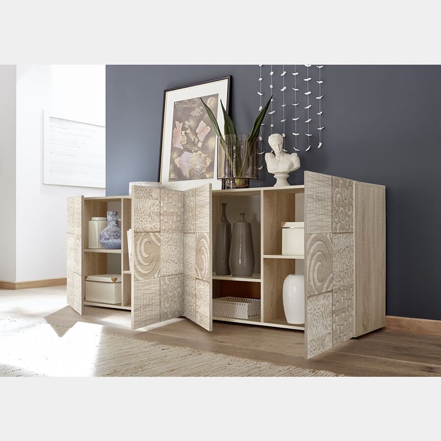 - Madia a 4 ante, moderna e di design. La madia è serigrafata e in finitura rovere. All'interno la madia è suddivisa da 4 ripiani alternati in varie altezze, spezzando la solita monotonia.