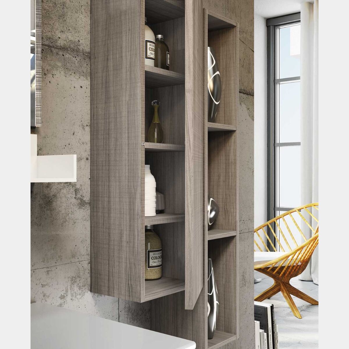 A completamento del mobile bagno è possibile richiedere lo specchio, la mensola, il pensile sospeso con anta e il pensile a giorno sospeso, personalizzando le finiture tramite apposito configuratore.